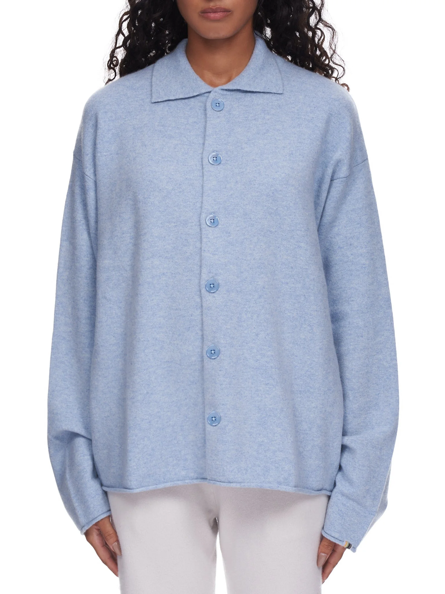Extreme Cashmere shirt in blue, lapel collar, tonal front button closure, long sleeves, raw hemlines. One Size. Composition: 88% Cashmere, 10% Nylon, 2% Elastane. Model is 5ft 9” and is wearing a size OS. Bust: 32” Waist: 24.5” Hip: 35.5"