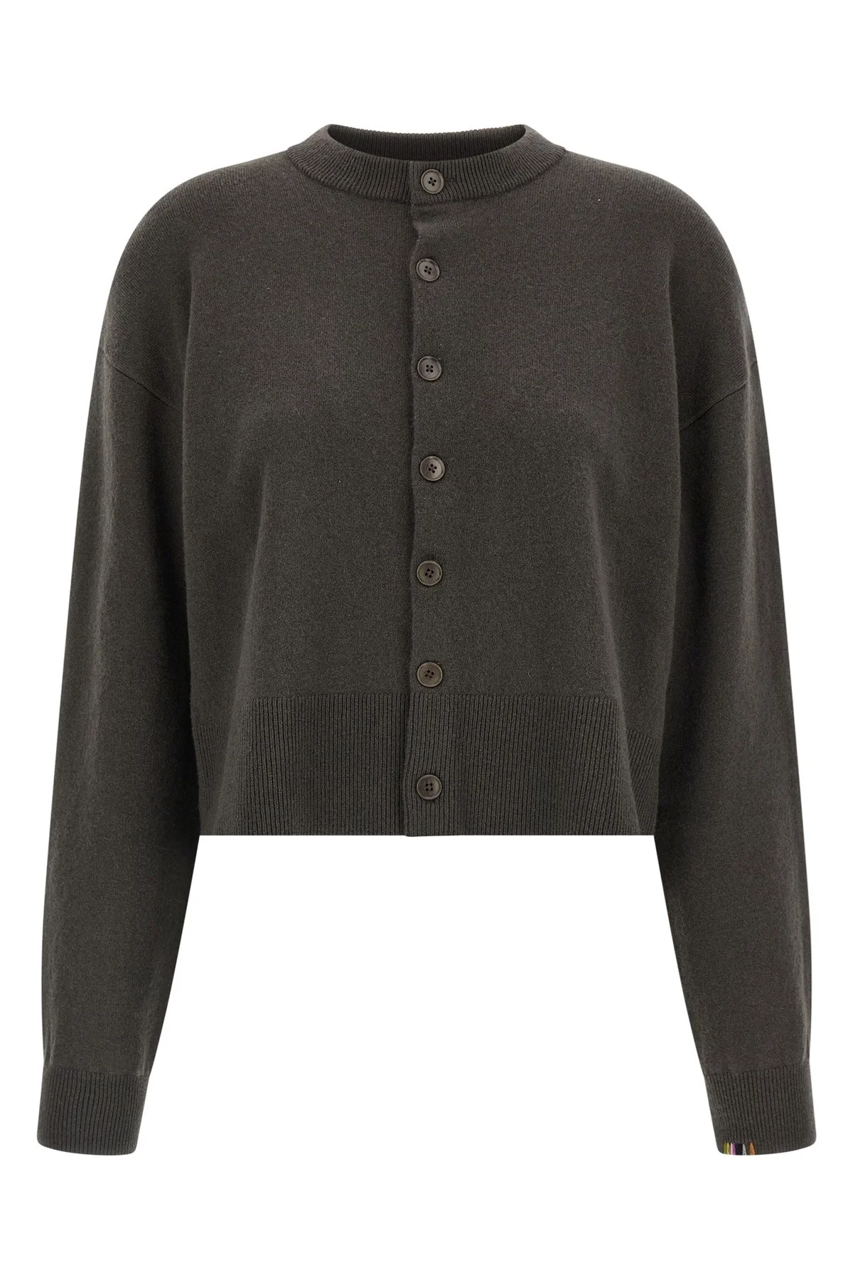 cod. N170CHOUMUD 'N°170 Chou' cashmere blend cardigan with crew neck, front corozo button closure, long sleeves with cuffs and dropped shoulders. Color: Brown Size & Fit: boxy fit - ONE size Suits XS – L Best Composition: 88% ws, 10% pa, 2% ea Made in: China