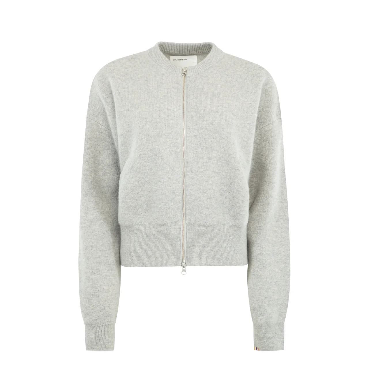 EXTREME CASHMERE Xtra Fun Cardigan featuring a classic crew neck, jacquard knit, a cropped bomber fit, two-way full-length zipper and two side pockets. 100% cashmere. DESIGNER STYLE ID: 478-003-13-TU-02 COLOR: GREY
