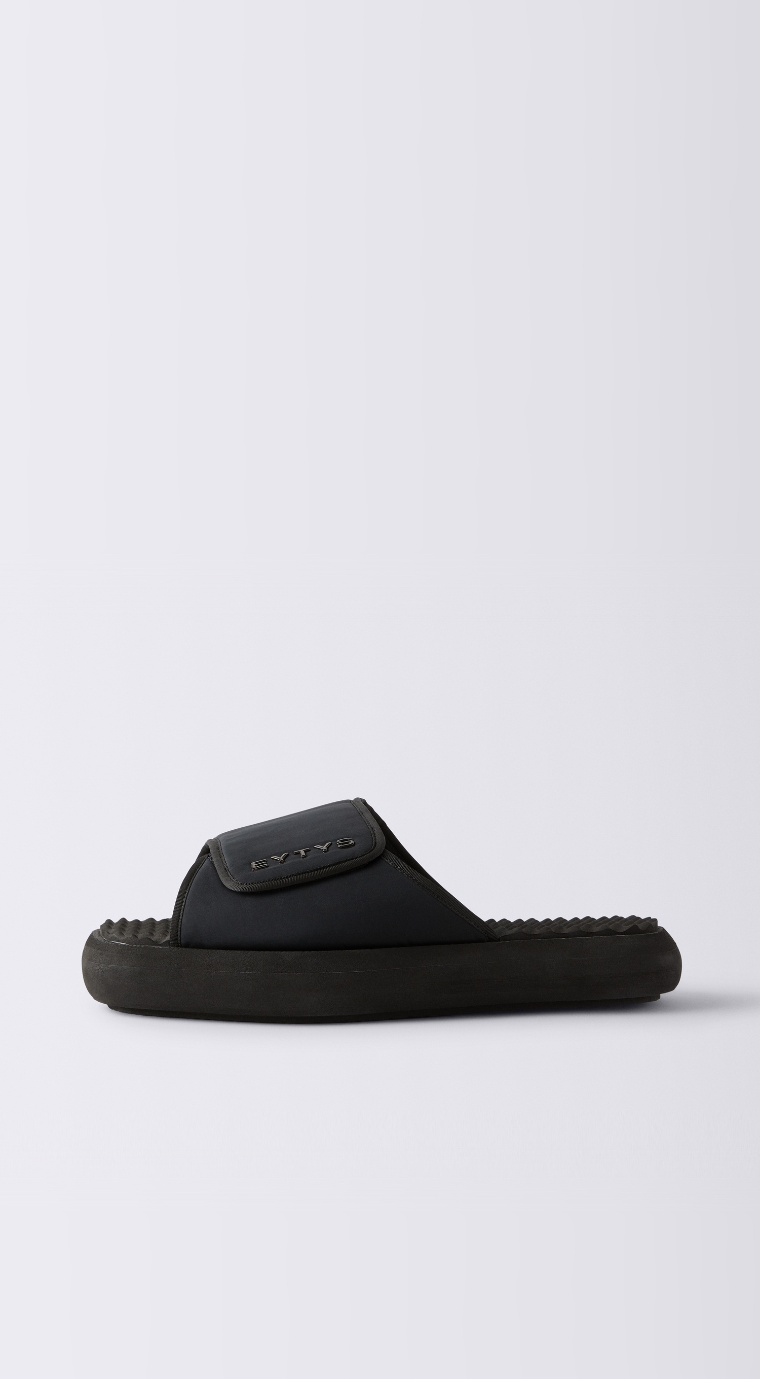 The 'Alessa' Nylon Black slippers feature a platform sole crafted from lightweight foam ensuring comfort and support. An adjustable velcro strap is detailed with the EYTYS logo in lettered metal. These sandals fit large, we recommend taking one size smaller than your normal size for a more comfortable fit. Product Details: - Upper: Nylon - Lining: Terry cotton - Lightweight EVA sole - Soft EVA footbed w. TPU logo - Velcro fastening - Made in Vietnam