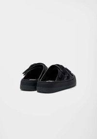 Modeled on the ’Sonic’ rounded sole and ample toe, the buffed ’Capri’ pool slipper brings seasonal newness paying homage to sweltering summer days. A vegan-friendly style in Black synthetic leather and neoprene with adjustable rubber straps. Product Details: - Main material: neoprene - Metal studs - Rubber/Plastic straps - Elastic - Made in Vietnam