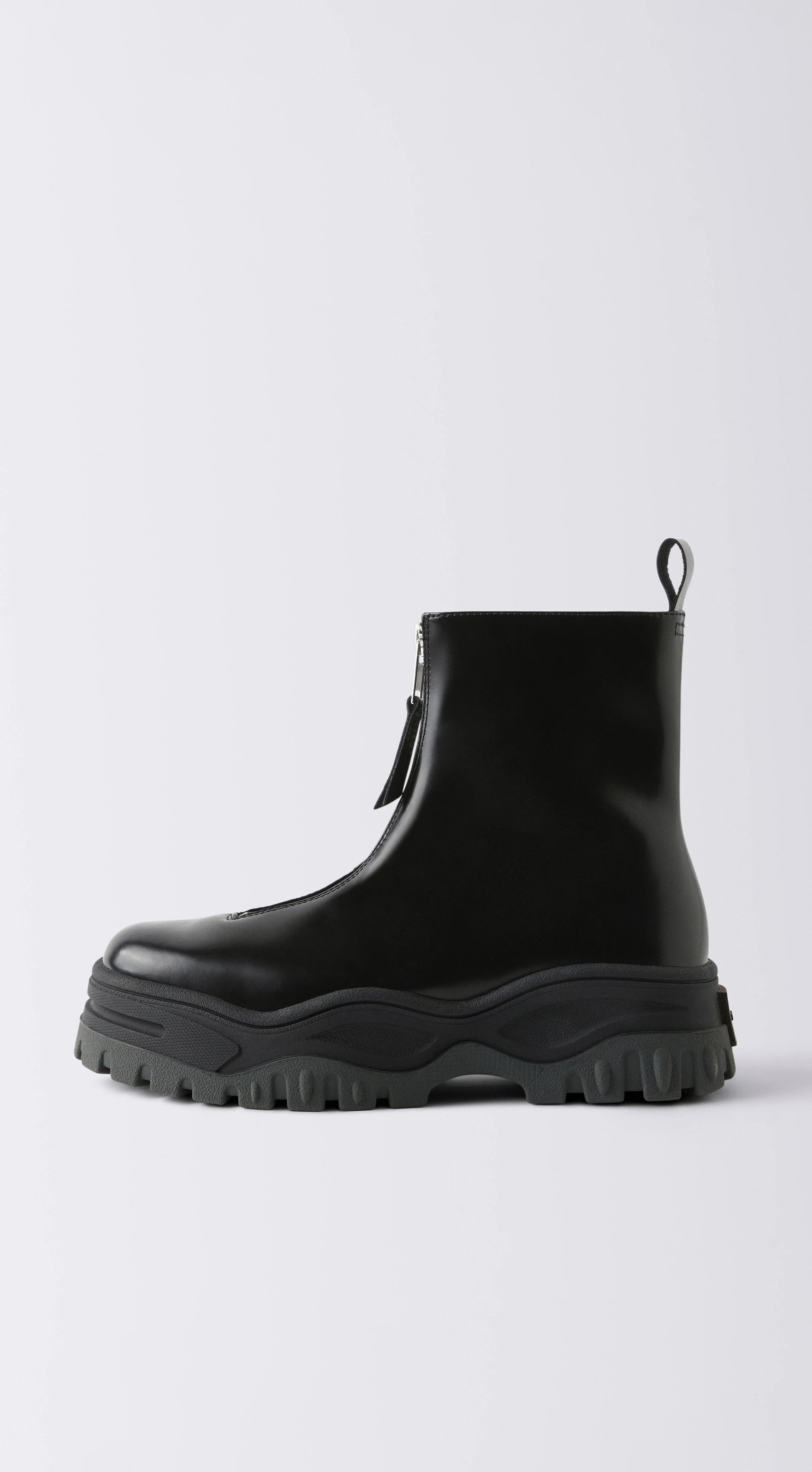 Rugged boot featuring a high elegant shaft with a heavy-duty silver zipper at the front. Made from shiny calf leather. Product Details: - Upper: cow leather - Lining: calf leather/cotton - Made in Vietnam"