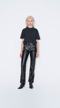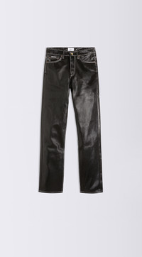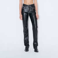 Eytys mid rise straight silhouette denim. Comes in a black laminate finished cotton quality. Hedda is 174 / 5’8” and is wearing 26/34. Product Details: - Shell: 100% cotton w. PU coating - Regular straight fit - Contrast stitching - Made in Italy - Unisex