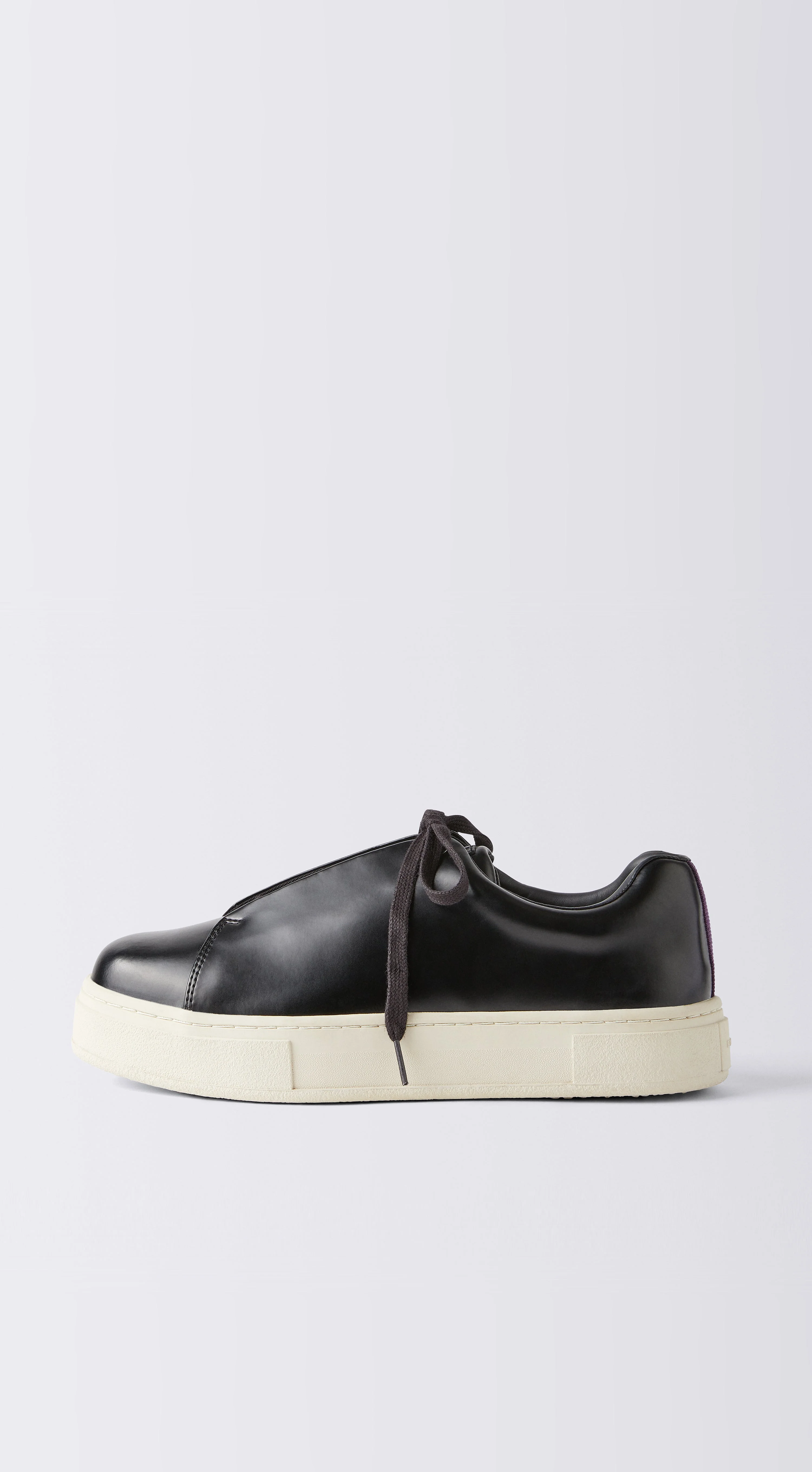 A minimalist style made in shiny black leather. The dressy ’Doja’ sneaker is a minimal, low-top silhouette with a voluminous toe and concealed laces on a stylized rubber sole. Product Details: - Upper: cow leather - Lining: leather / cotton - Made in Vietnam