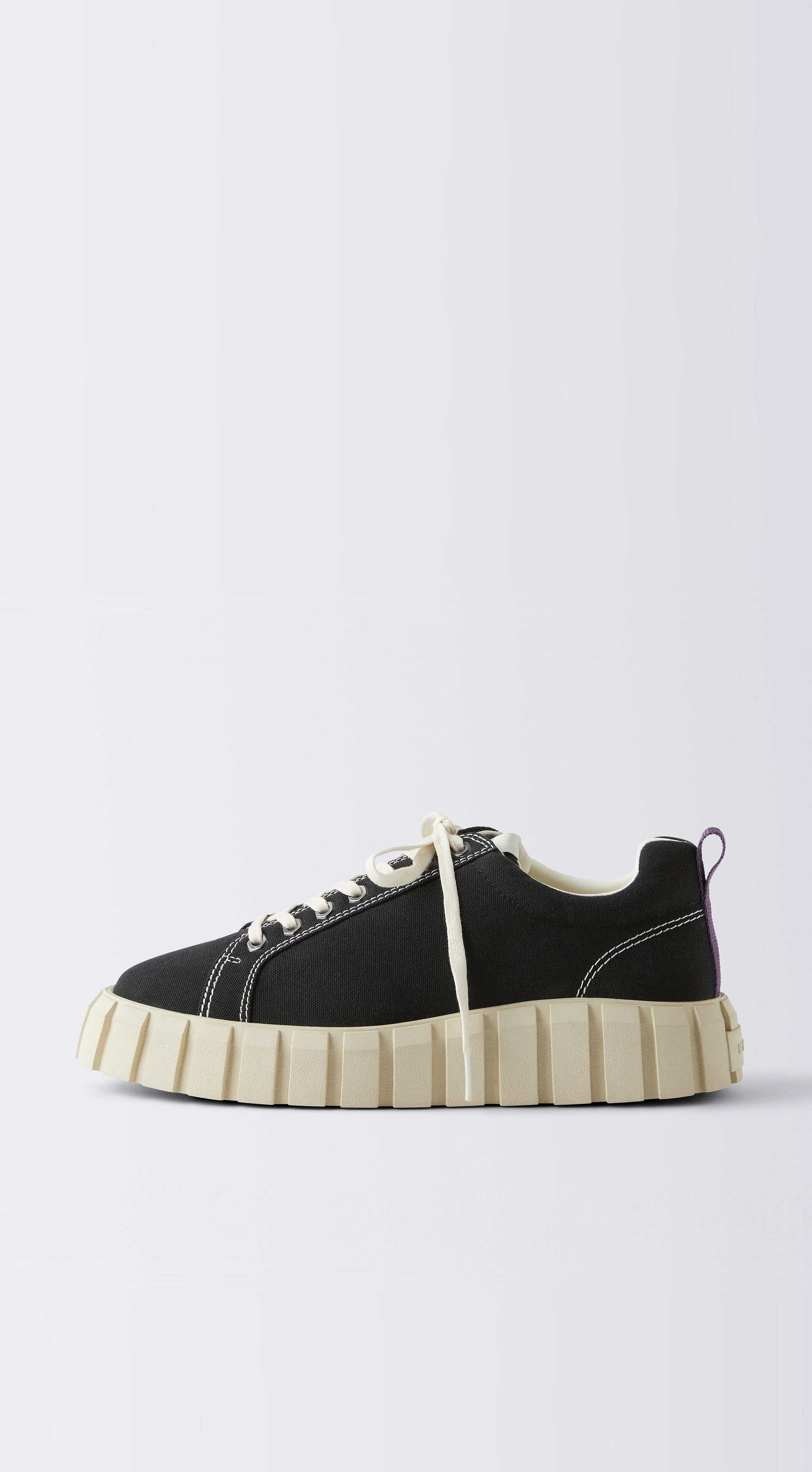 The ’Odessa’ low-top is a brutalist interpretation of ’50s athletic shoes. Comes in black canvas with contrast stitching and a flexible rubber sole. A vegan-friendly, easy going lace-up style. Product Details: - "Upper: cotton canvas - Lining: PU / cotton - Rubber sole - Textile insole - Arch support - Hexagonal metal eyelets - 2 sets of laces - Label w. logo on tongue - Padded collar / tongue - Made in Vietnam"