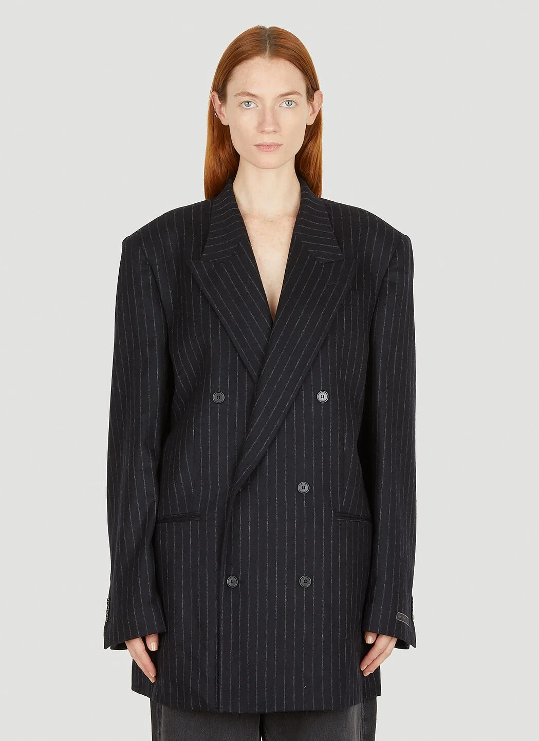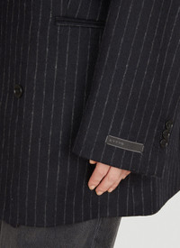 - Wool-blend fabrication in a close weave - Peak lapels - Double breasted closure - Chest welt pocket - Padded shoulders - Long sleeves - Buttoned cuffs - Logo patch at cuff - Side slip pockets - All-over pinstripe motif - 80% Wool, 20% Polyamide. Dry clean - Color: Black - Code: A032003