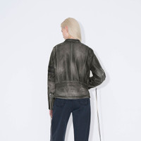 The racing jacket ‘Damon’ comes in smooth vintage black leather with black accent stripes. This slim-fit design includes zip pockets, elbow foam padding, and gusseted sleeve zips with lengthy leather pull-straps. Completed with EYTYS logo artwork on the back padded patch, along with an embossed EYTYS logo on the chest. Josefine is 176 / 5’9” and is wearing women’s size 36. Product Details: - Shell: 100% cow leather - Lining: 55% polyester, 45% viscose - Relaxed fit - Made in Portugal - Unisex