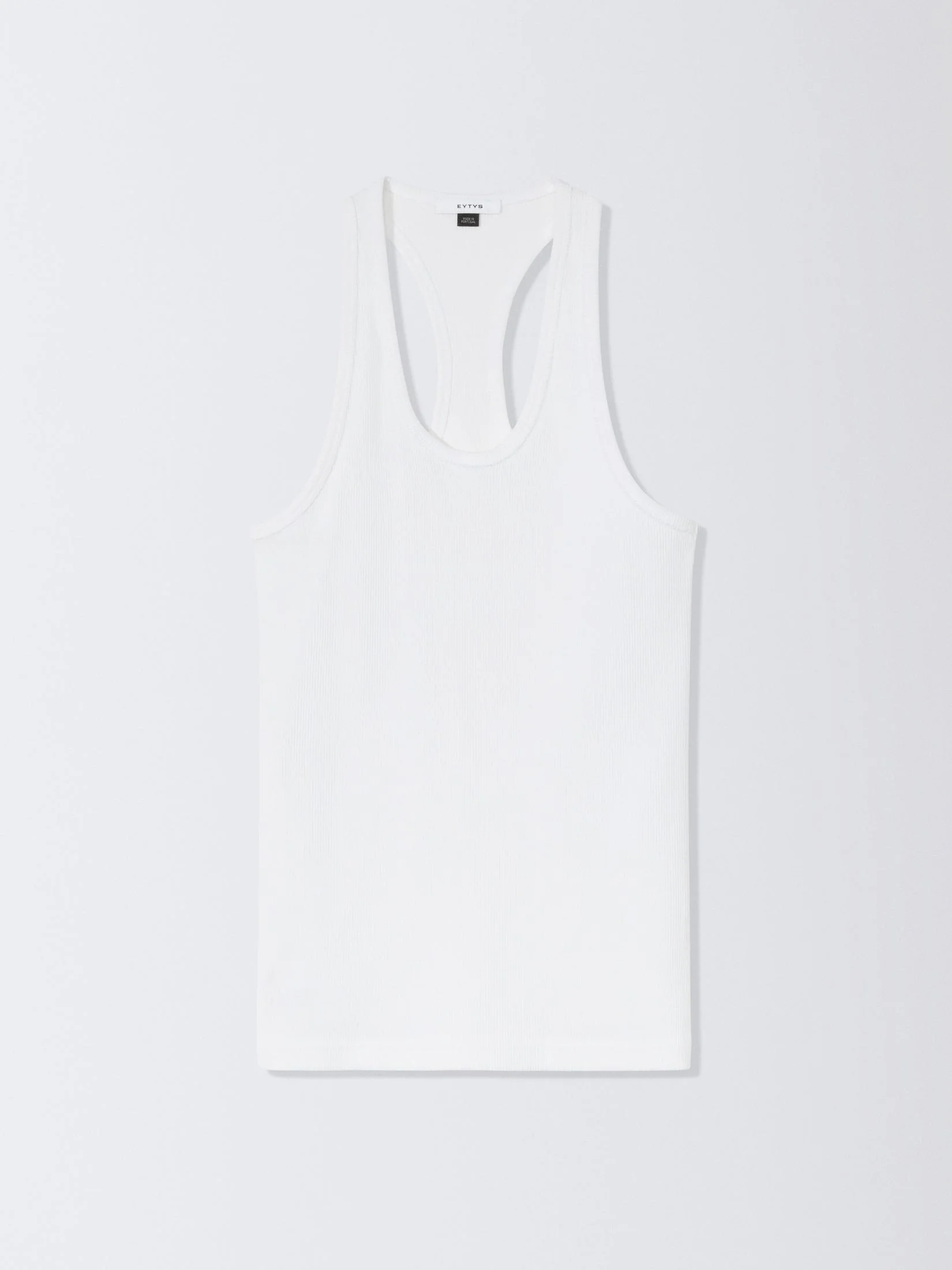 Ribbed tank top. Racer back tank top combining sporty and elegant details. Crafted in a mid-weight jersey rib with raw edged binding details. With EYTYS satin label branding on the front hem. Product details • Shell: 96% organic cotton 4% elastane • Slim fit • Eytys woven label at hem • Made in Portugal