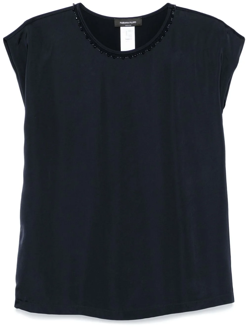 bead-detailed blouse Highlights - Midnight blue - Satin weave - Bead detailing - Crew neck - Cap sleeves - Curved hem Made in Italy Composition Viscose 100%, glass 40%, Nylon 30%, Polyester 30% Washing instructions Dry Clean Only