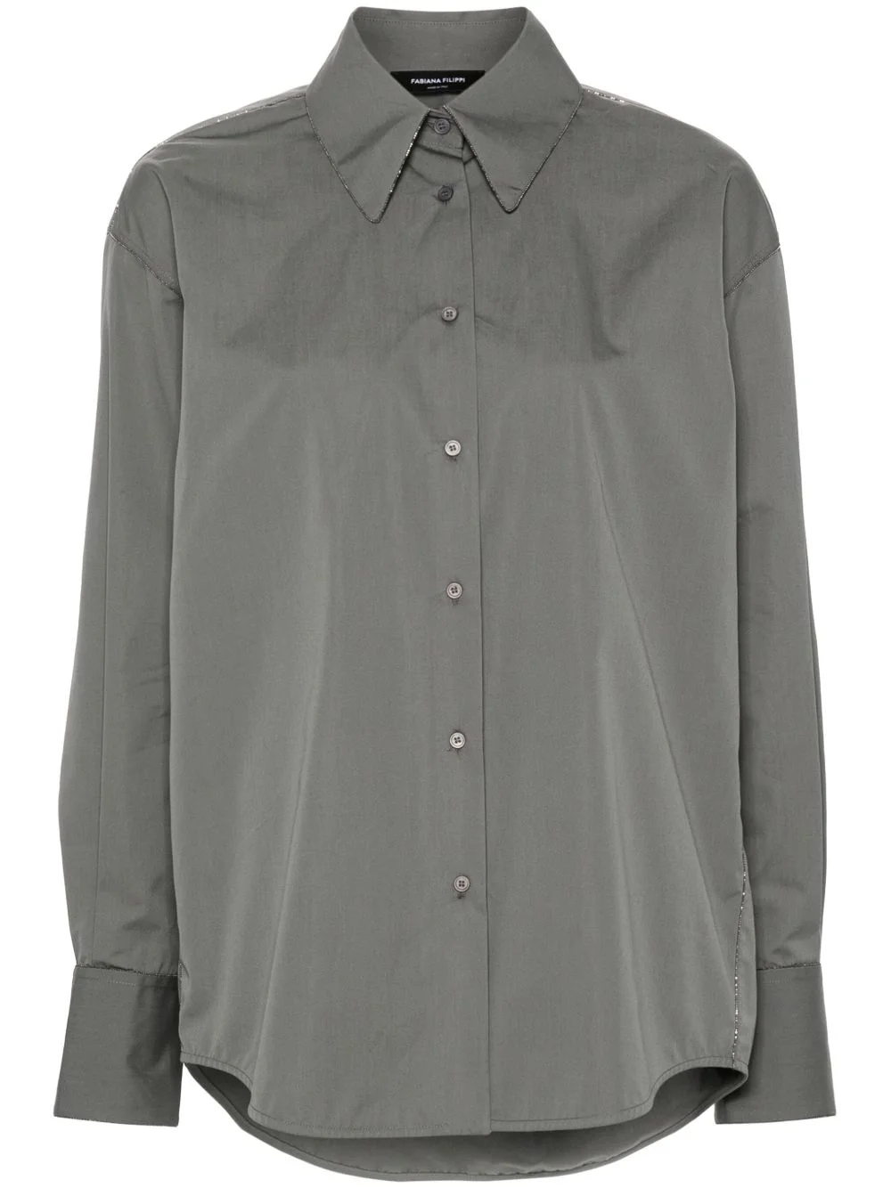 beaded-trim poplin shirt Highlights - Medium grey - Cotton - Poplin texture - Beaded trim detail - Pointed flat collar - Long sleeves with buttoned cuffs - Pleat detailing to the sleeve - Curved hem - Rear box-pleat detail - Front button fastening Made in Italy Composition Eco Brass 100%, Cotton 100% Washing instructions Hand Wash