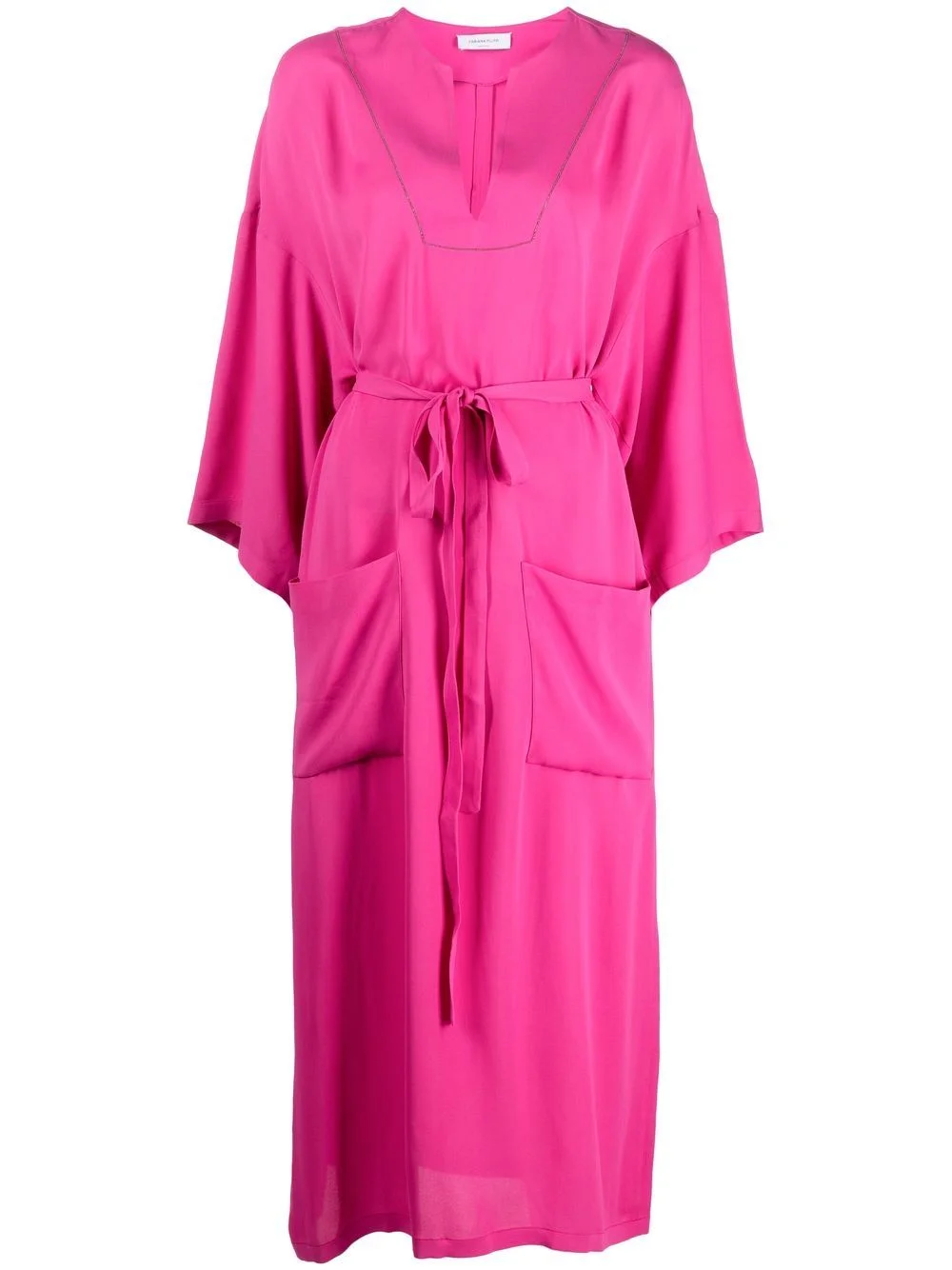 belted long-sleeved midi dress fuchsia pink V-neck rhinestone embellishment long wide sleeves tied waist two front patch pockets straight hem Made in Italy Composition Lining: Polyester 100% Outer: Viscose 100%, Eco Brass 100% Washing instructions Dry Clean Only