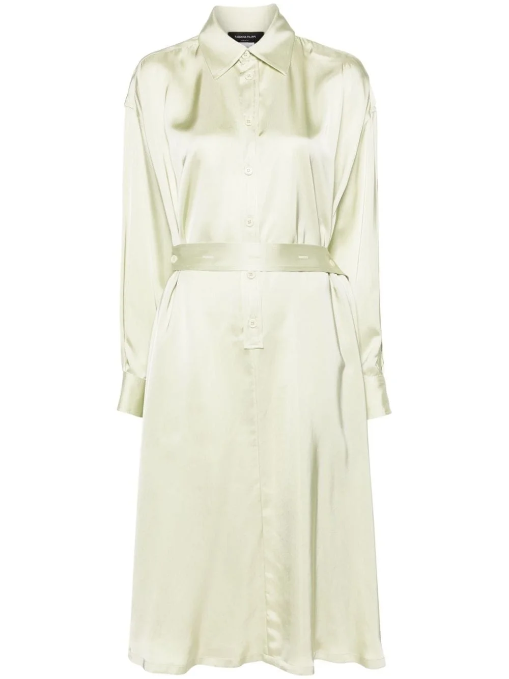 belted midi shirtdress Highlights - Mint green - Satin finish - Classic collar - Front button placket - Drop shoulder - Long sleeves - Buttoned cuffs - Detachable and adjustable waist belt - Straight hem - Mid-length Made in Italy Composition Viscose 100% Washing instructions Dry Clean Only