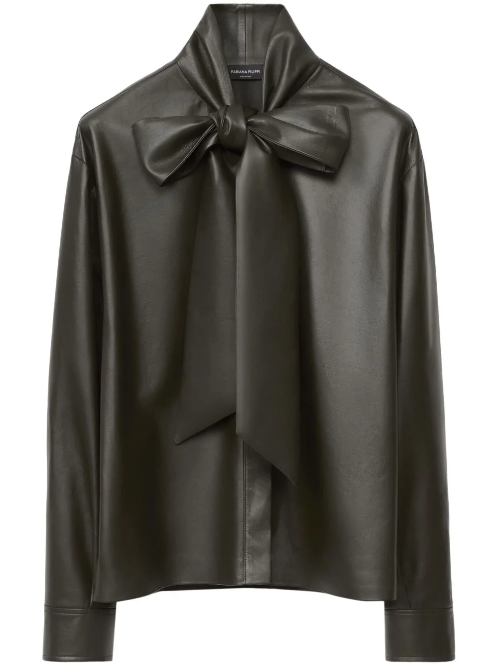 bow detailing shirt Highlights - Olive green - Lambskin - Concealed front button fastening - Gathered tie neck - Bow detailing - Long sleeves - Buttoned-cuff sleeves - Straight hem Made in Italy Composition Lamb Skin 100% Washing instructions Specialist Cleaning