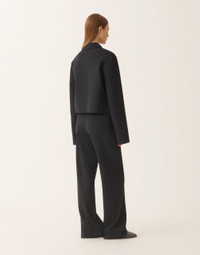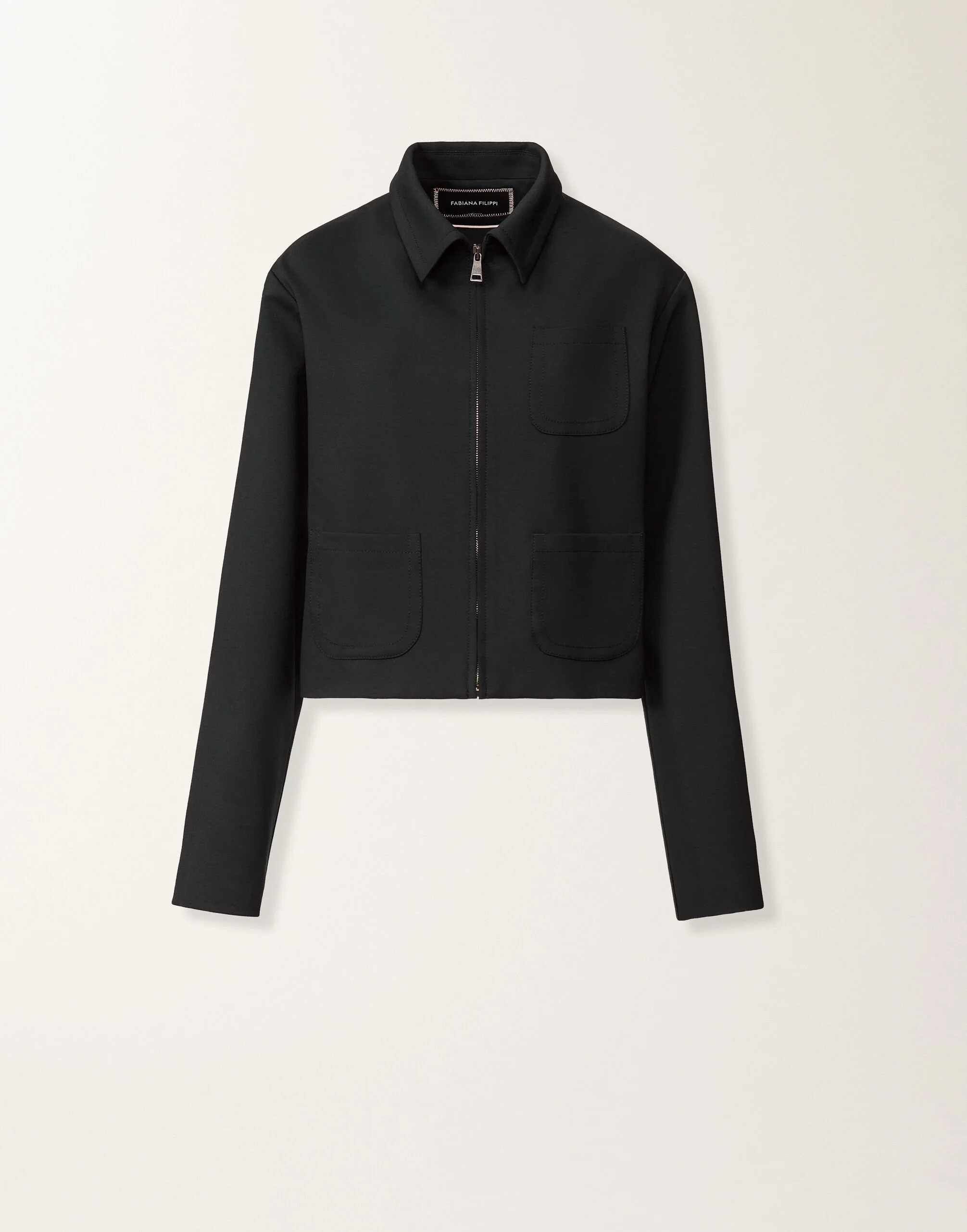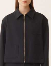 Short boxy jacket with zipper in Milano stitch jersey, a fabric with a double, compact structure that offers a clean line and a smooth, refined surface. An essential and versatile piece, perfect for a contemporary style. Made in Italy through sustainable processes. The model is 1,76 m tall and wears size IT 40. Details Milano knit jersey Short boxy Zip Fabric: 56% viscose – 36% polyamide - 8% elastane Length: 55 cm (size 40) Made in Italy Model GCD266F208L74700005146