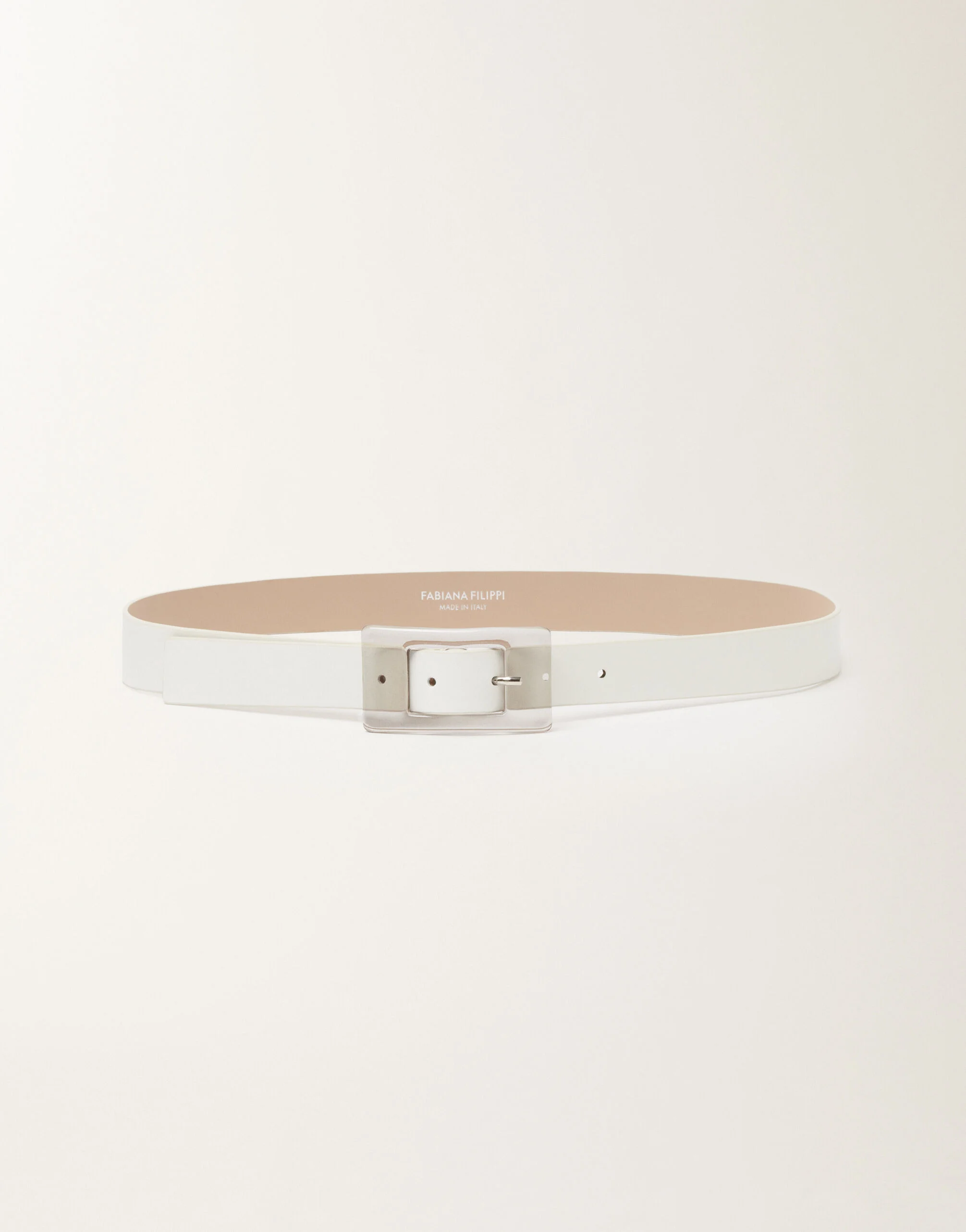 Contemporary design belt in soft calf leather, enhanced by a plexiglass buckle that defines its style. Entirely made in Italy using sustainable processes. The model is 1,8 m tall and wears size IT 40. Details Plexiglass buckle 100% calf leather Made in Italy Model AAD266A860M02600000145