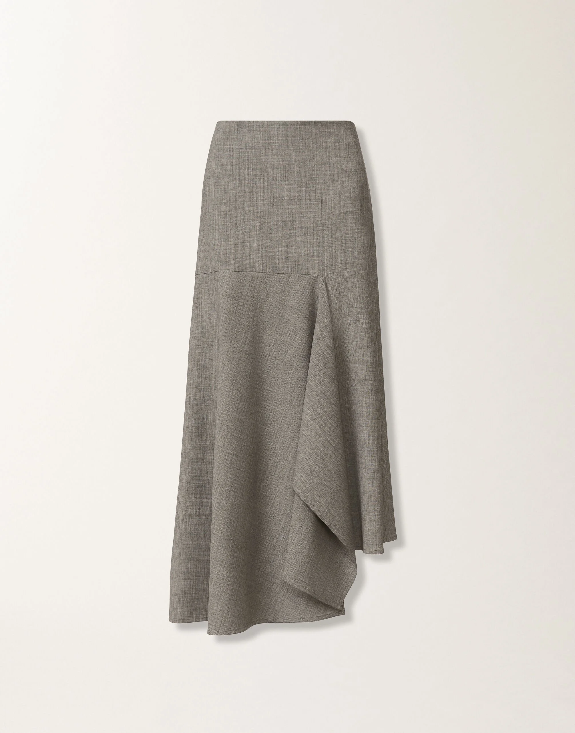 Sinuous lines sculpt this asymmetric skirt, crafted from lightweight bi-stretch wool for a flawless fit. An elegant and versatile garment, produced entirely in Italy with sustainable processes. The model is 1,78m tall and is wearing size IT 40 Details Bi-stretch cool wool Asymmetric Fabric: 75% wool – 23% polyamide – 2% elastane Lining: 100% polyester Made in Italy Model GND215F414D62000008179