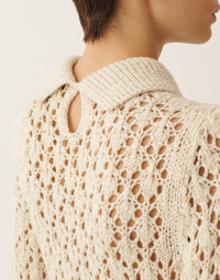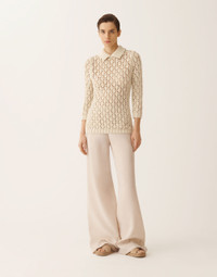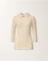 Polo collar sweater with an oversized fit crafted from cotton ribbon with sequins, designed in an exclusive stitch pattern that echoes the natural design of the thistle. The contrast between the irregular cotton ribbon and the sequins creates a textured and luminous effect of great refinement. Entirely made in Italy using sustainable processes. Details Cotton ribbon Sequins Thistle stitch Fabric: 69% cotton – 17% polyamide – 14% polyester Made in Italy Model MAD276F557M1020000VR1