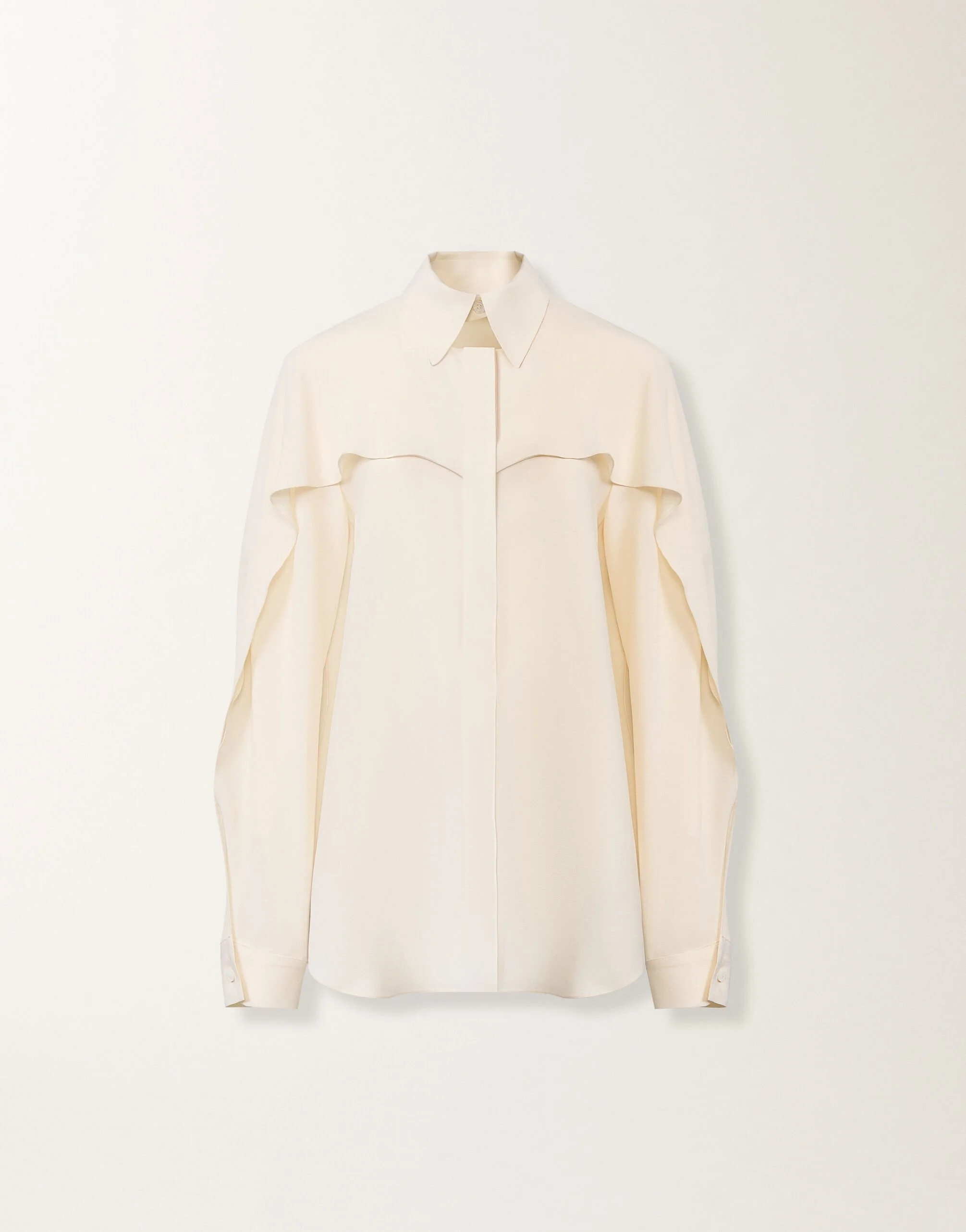 Shirt in a new crepe de chine silk blend fabric with an elegant washed finish, featuring a matte texture and a fluid feel, envelops the silhouette enhancing its femininity. The piece stands out for the flap detail on the front and sleeves. Entirely made in Italy using sustainable processes. The model is 1,8 m tall and wears size IT 40. Details Crepe de chine Flap detail Fabric: 68% acetate – 32% silk Length: 66.5 cm (size 40) Made in Italy Model CAD266F315D94300000145