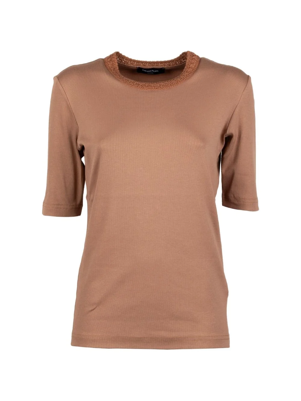 crew-neck top Highlights - Wicker brown - Lace trim - Crew neck - Short sleeves - Ribbed knit Made in Italy Composition Cotton 94%, Elastane 6% Washing instructions Read Manufacturer Guidelines