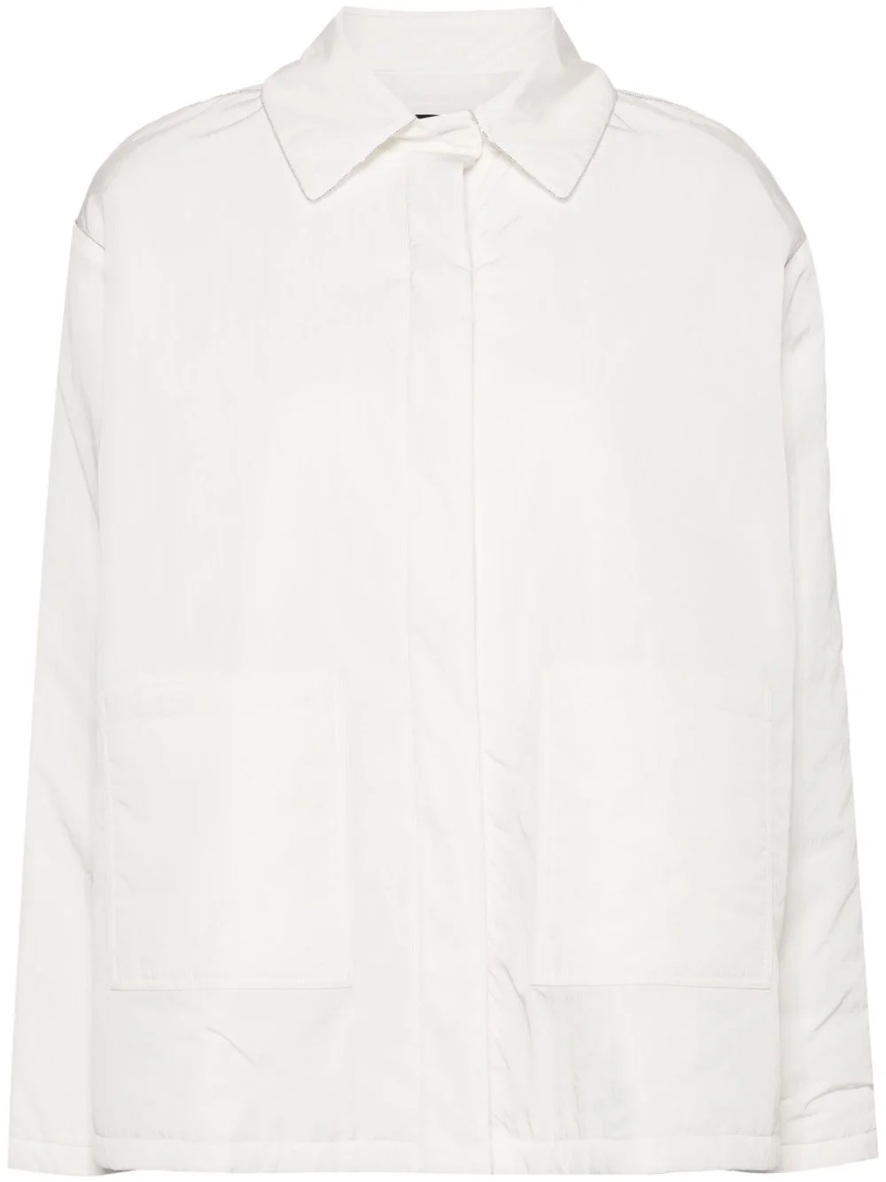 crinkled padded shirt jacket Highlights - White - Padded design - Crinkled finish - Beaded trim detail - Classic collar - Concealed press-stud fastening - Long sleeves - Side slits - Straight hem - Two front patch pockets Made in Italy Composition Lining: Polyamide 100%, Polyester 100% Outer: Polyamide 100% Washing instructions Dry Clean Only