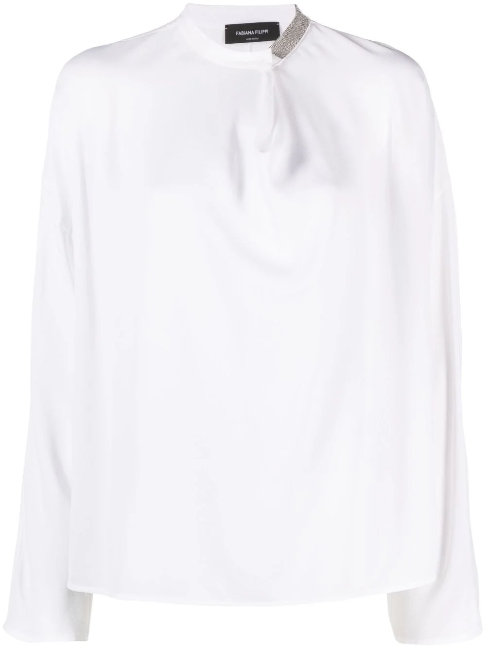 crystal-embellished blouse Highlights - White - Crystal embellishment - Mock neck - Gathered neckline - Long sleeves - Curved hem Made in Italy Composition Eco Brass 100%, Acetate 57%, Silk 43%