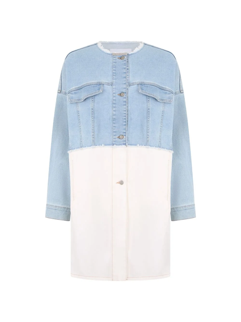 denim two-tone dress Highlights - Blue/white - Two-tone design - Front button closure - Classic collar - Chest pockets - Long sleeves Made in Italy Composition Cotton 98%, Polyester 2% Washing instructions Read Manufacturer Guidelines