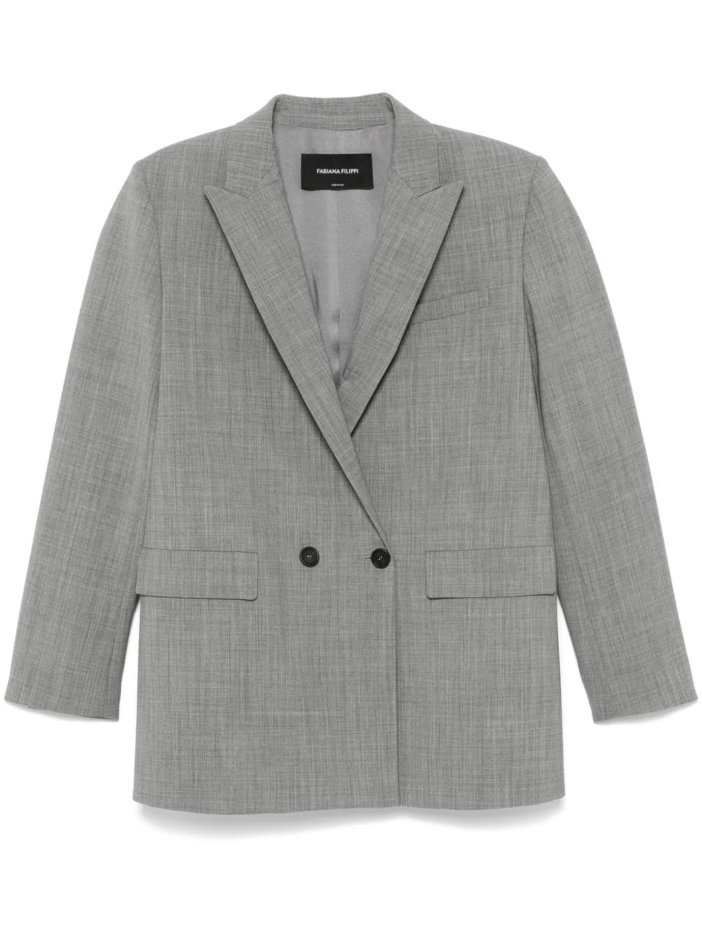 double-breasted blazer Highlights - Nickel grey - Virgin wool blend - Interlock weave - Double-breasted button fastening - Peak lapels - Shoulder pads - Long sleeves - Split cuffs - Chest welt pocket - Dart detailing - Two front flap pockets - Central rear vent - Full lining - Straight hem Made in Italy Composition Outer: Virgin Wool 75%, Polyamide 23%, Elastane 2% Lining: Polyester 100% Washing instructions Dry Clean Only