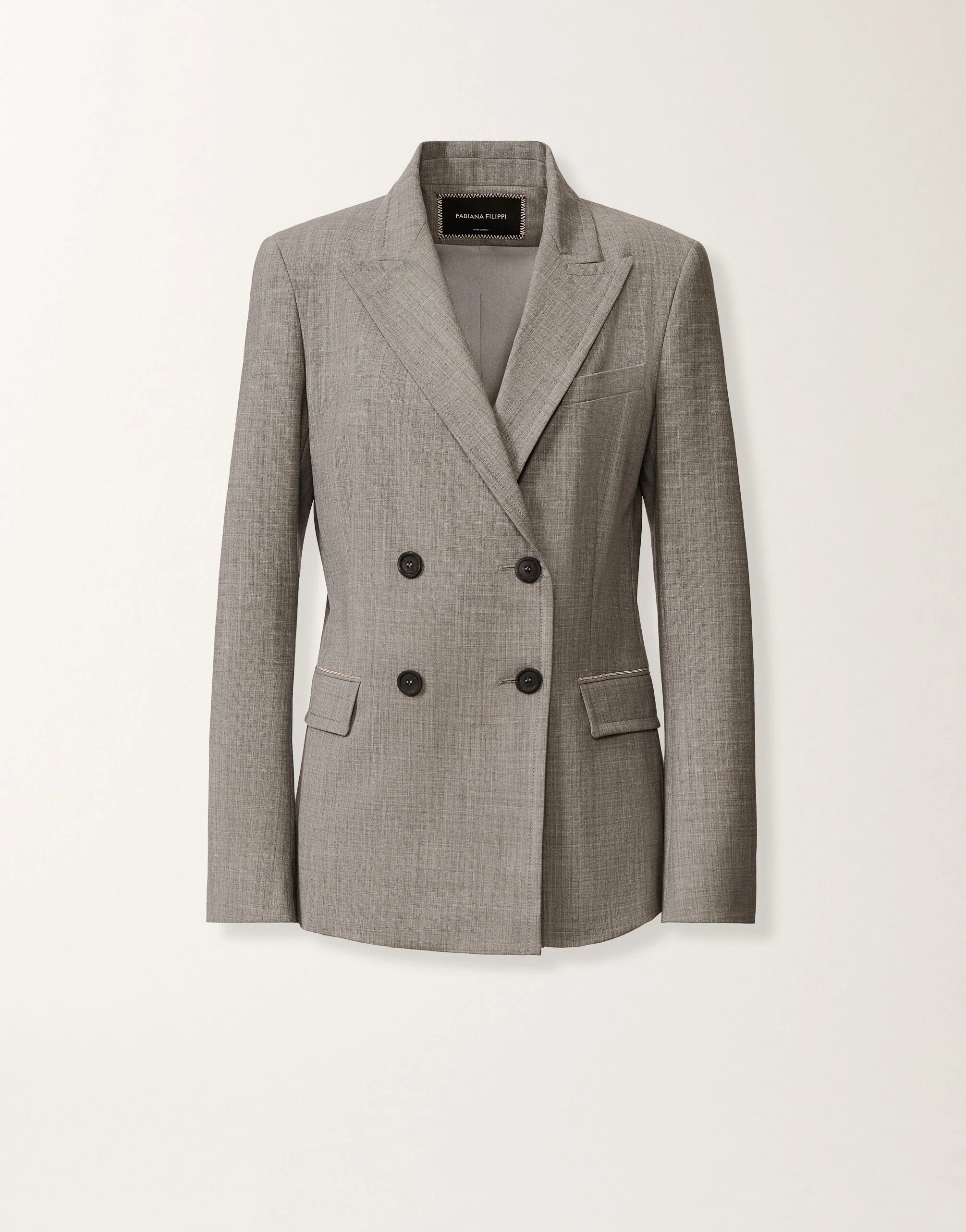 The Spring Summer 2026 pre-collection celebrates the uniqueness of materials, as seen in this micro double-breasted jacket made from lightweight bi-stretch wool, enhanced with a brilliant filo diamante. Featuring a slim fit, it is entirely crafted in Italy using sustainable processes. The model is 1,8 m tall and wears size IT 40. Details Fresco wool bistretch Filo diamante Slim Fabric: 75% virgin wool – 23% polyamide – 2% elastane Length: 66 cm (size 40) Made in Italy Model GCD266F214L76300008179