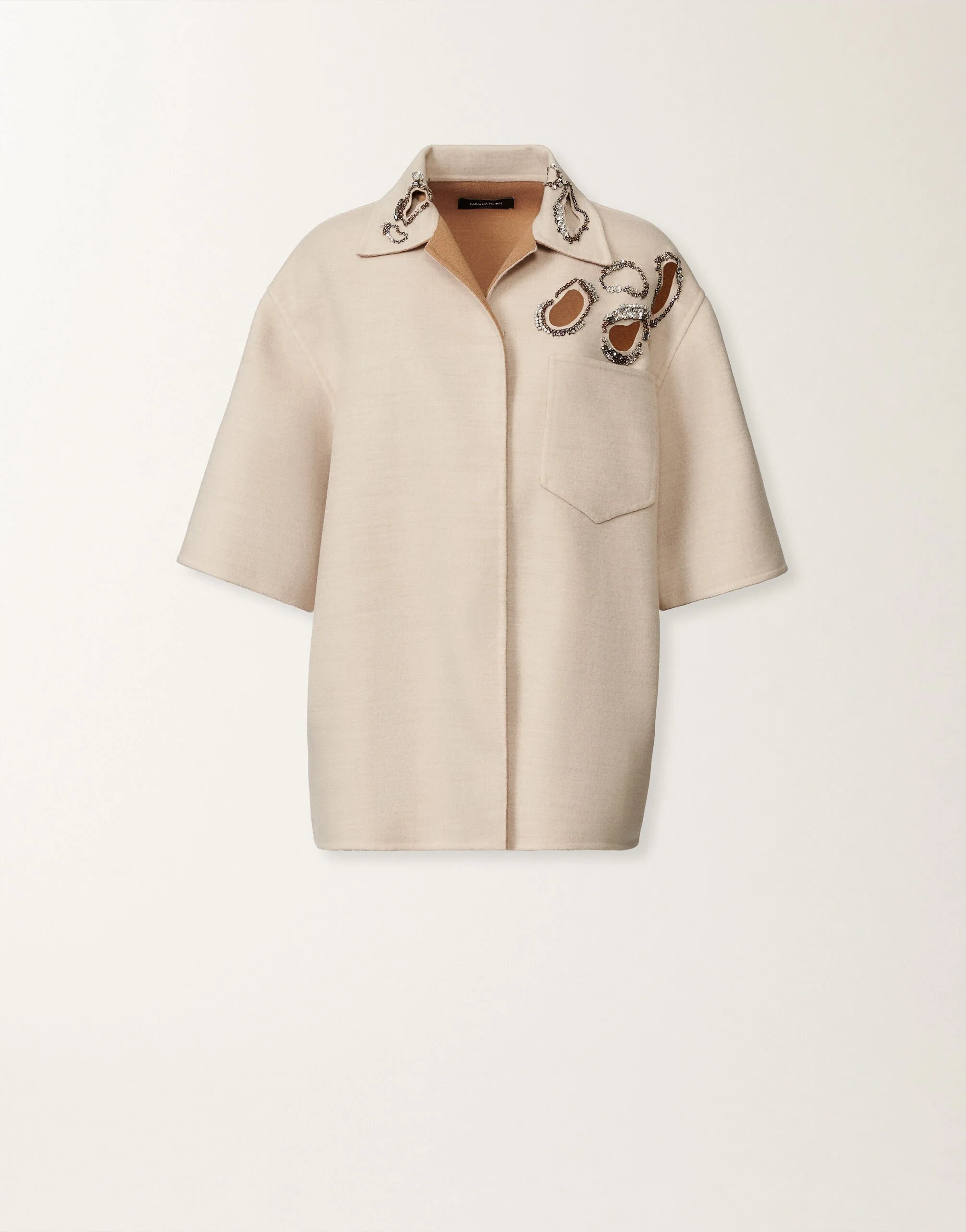 Refined oversized shirt jacket, made of fine double wool, a sophisticated and enveloping handmade fabric. Embellished with Buchi embroidery, created entirely by hand. Inspired by Alberto Burri's plastic combustion technique, each element is individually applied with exquisite decorations of set crystals and rhinestones. Created in Italy through sustainable processes. The model is 1,77m tall and is wearing size IT 40 Details Double wool Eyelet embroidery Fabric: 100% virgin wool Length: 70 cm (size 40) Made in Italy Model CTD215F306L5530000VR3