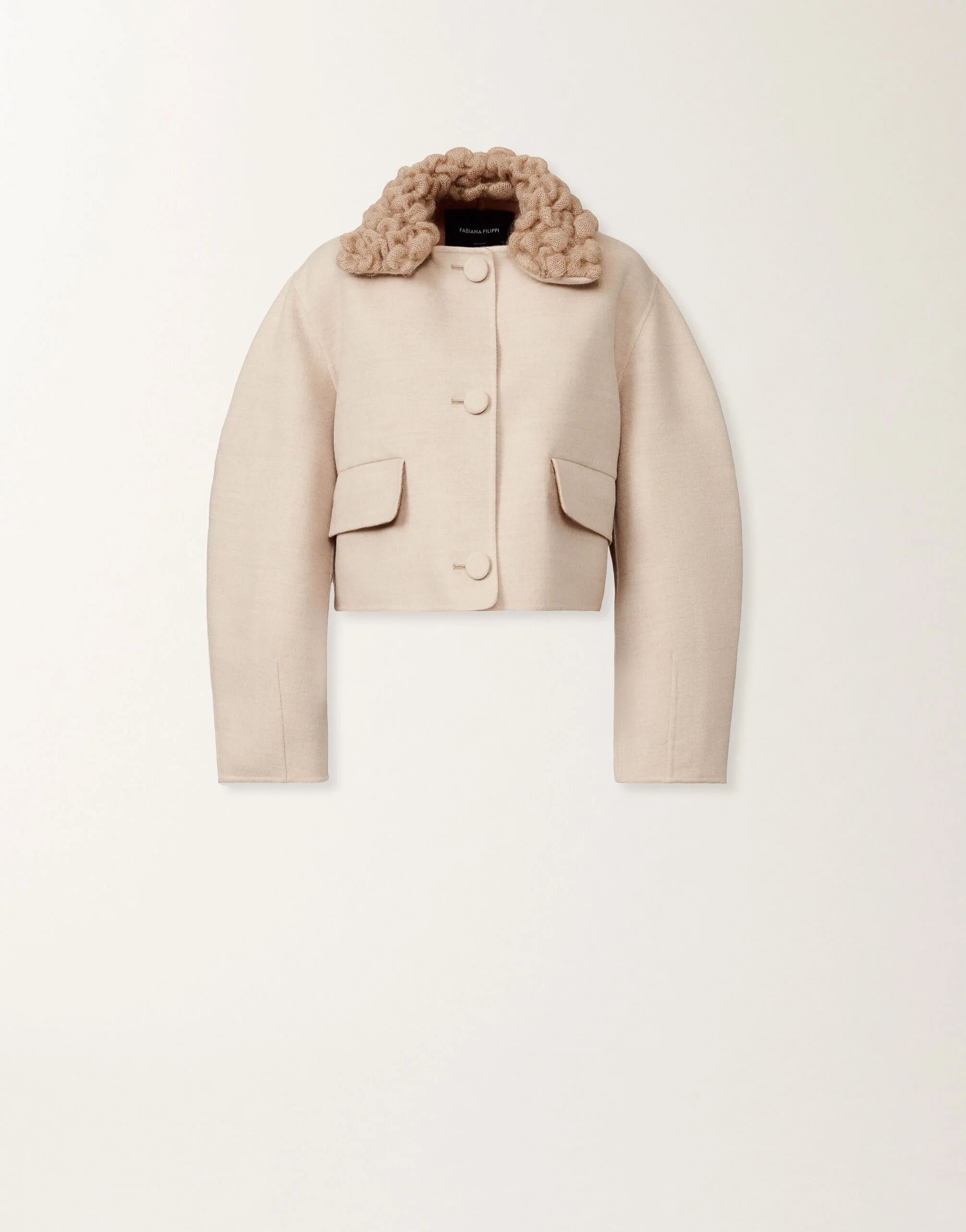 Versatile short jacket in fine double wool, a sophisticated and enveloping handmade fabric. Featuring a mohair shirt collar, it is produced entirely in Italy through sustainable processes. The model is 1,77m tall and is wearing size IT 40 Details Double wool Fabric: 100% virgin wool Knit collar: 65% mohair – 33% nylon – 2% virgin wool Length: 55 cm (size 40) Made in Italy Model CTD215F261L5110000VR3