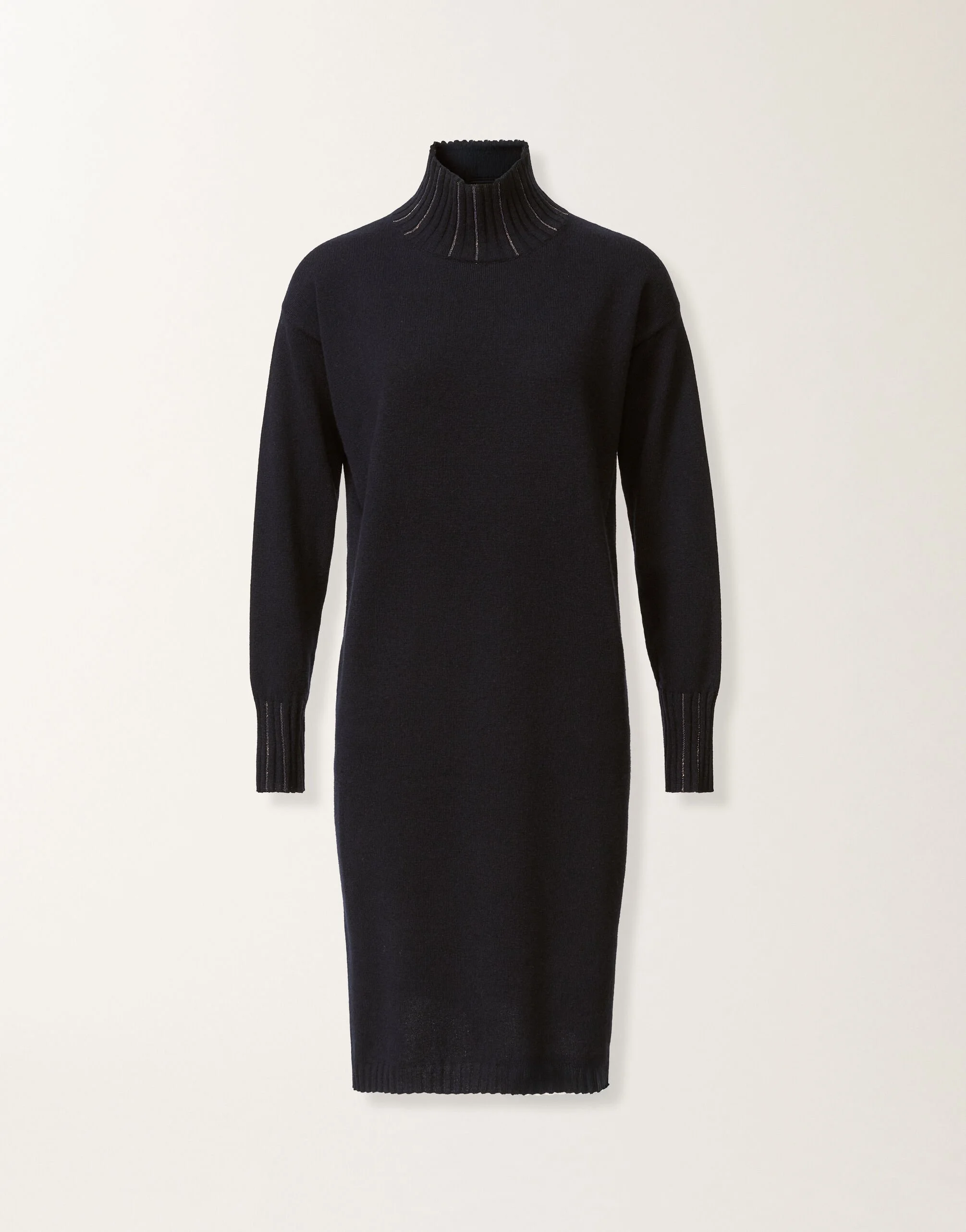 Made from Platinum, the exclusive Fabiana Filippi yarn that blends wool, cashmere, and silk, this loose-fit dress features a high neckline and ribbed diamond-thread embroidery, entirely produced in Italy through sustainable methods. The model is 1.76 meters tall and wears size IT 40. Details Platinum yarn Diamond thread between ribs Fabric: 75% wool – 15% silk – 10% cashmere Length: 96 cm (size 40) Made in Italy Model ABD225F588L51700005146