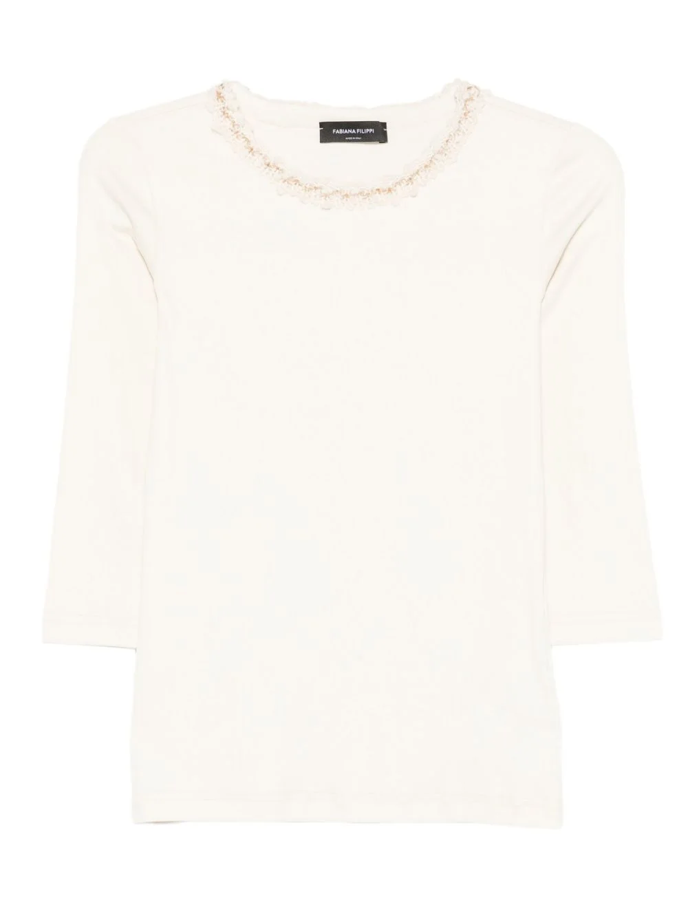 embellished three-quarter sleeve T-shirt Highlights - Beige - Three-quarter sleeves - Round neck - Embellished neckline - Cotton Made in Italy Composition Cotton 94%, Elastane 6% Washing instructions Dry Clean Only