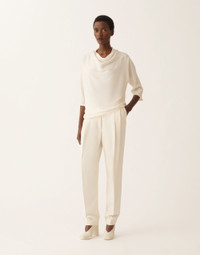 The essence of timeless elegance reimagined through modern lines is revealed in this elbow-sleeve top with shawl neckline in matte light enver satin. A luminous diamond-thread detail emphasizes its refinement. Entirely Made in Italy through sustainable production. Details Matte light enver satin Diamond thread Fabric: 82% acetate – 18% viscose Made in Italy Model TPD225F843L70300000145