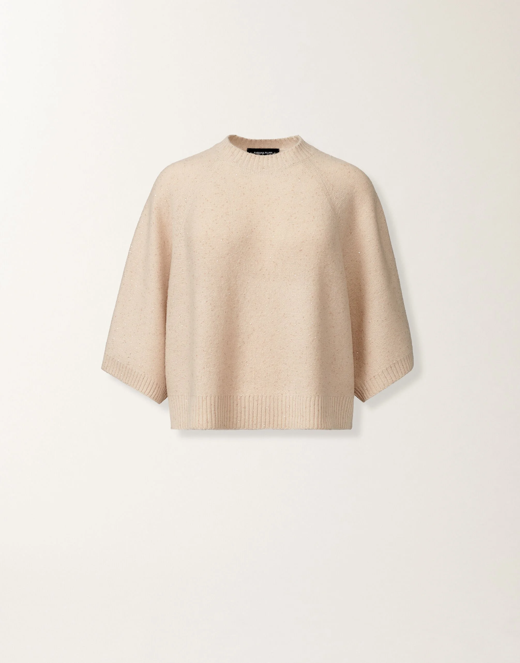 Featuring an essential and refined design, this short-sleeved cape with an oversized cut is made of a fine wool and silk yarn, embellished with bright sequins that give a touch of discreet elegance. Produced entirely in Italy through sustainable processes. The model is 1,77m tall and is wearing size IT 40 Details Wool and silk with sequins Short sleeve Over Fabric: 48% wool - 20% silk - 17% cashmere - 11% alpaca - 4% polyester Length: 56 cm (size S) Made in Italy Model MAD215F067D29600000158