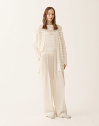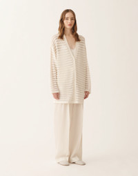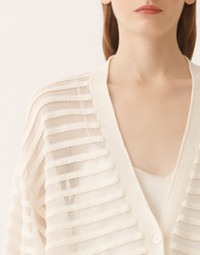 Oversized cardigan in cotton and linen with sequins, an iconic and lightweight yarn enhanced with micro sequins for a sophisticated shine. The scallop stitch, crafted with extra glossy thin viscose, creates elegant sheerness and makes this piece perfect for special occasions. Entirely made in Italy through sustainable processes. The model is 1,79 m tall and wears size IT 40. Details Cotton and linen with sequins Oversized Fabric: 61% cotton – 38% linen – 1% polyester Length: 76 cm (Size 40) Made in Italy Model MAD266F100L76800000142