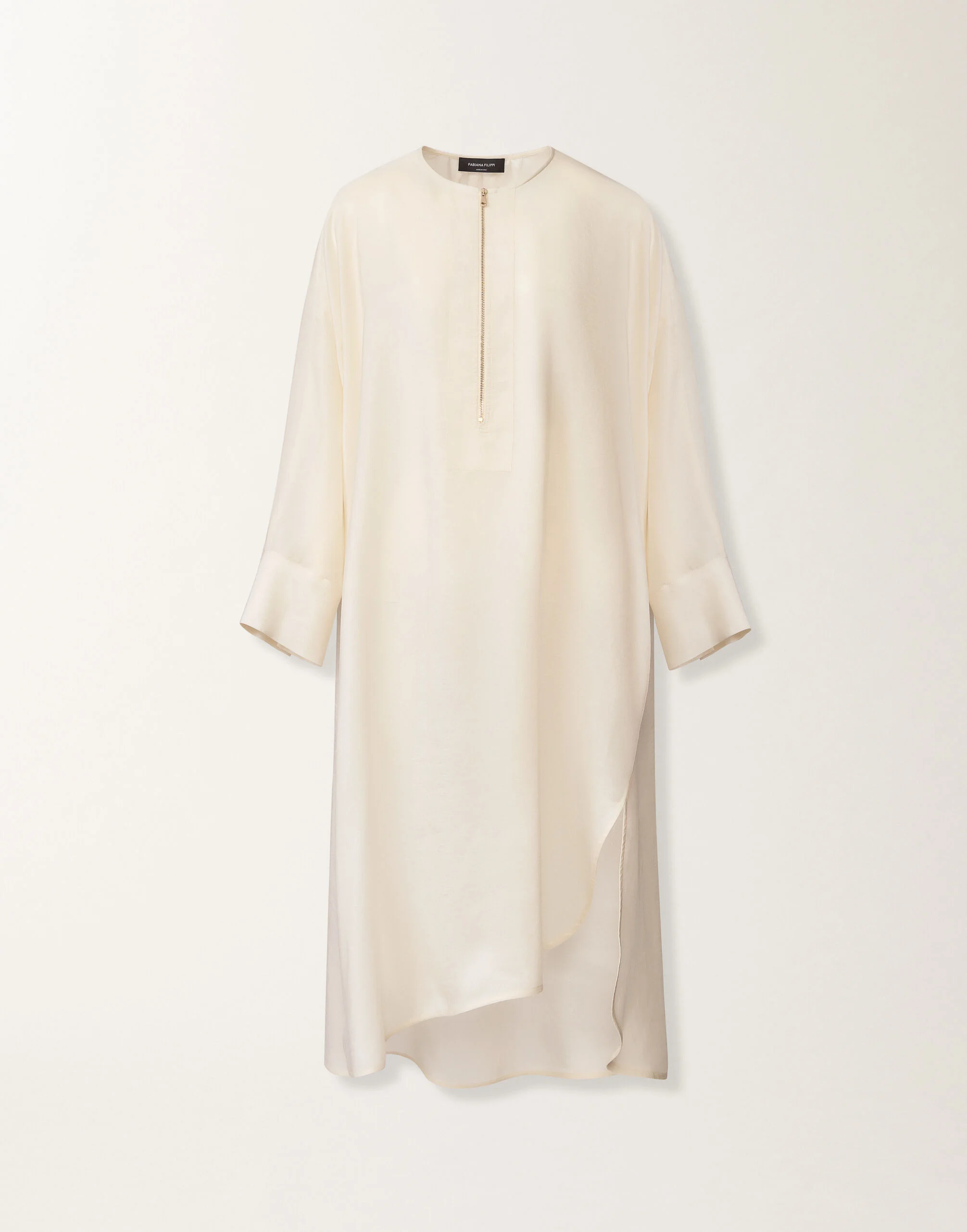 Midi dress with front zipper in fluid fabric with a “peach skin” effect, featuring 3/4 sleeves. Made from Lyocell, a sustainable fiber derived from eucalyptus, it offers a soft and enveloping texture reminiscent of washed silk, for a modern and feminine look. Entirely made in Italy through sustainable processes. The model is 1,79 m tall and wears size IT 40. Details Smooth peach-touch fabric Midi 3/4 sleeve Fabric: 100% lyocell Length: 125 cm (size 40) Made in Italy Model ABD266F183D95400000145