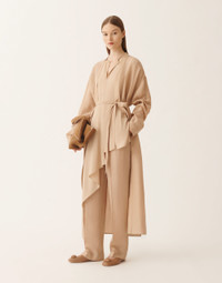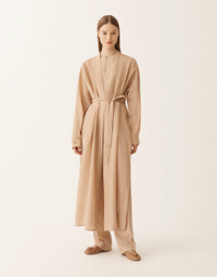 Shirt-style robe with a drawstring at the hem, crafted from a fluid fabric with a soft, lightweight feel. The premium Lyocell fiber, sourced from eucalyptus tree pulp, ensures durability, breathability, and a natural ability to absorb moisture. A versatile, elegant, and modern piece, entirely made in Italy using sustainable processes. The model is 1,76 m tall and wears size IT 40. Details Fluid Drawstring at the bottom Fabric: 100% lyocell Length: 128 cm (size 40) Made in Italy Model CAD266F181D95400000157