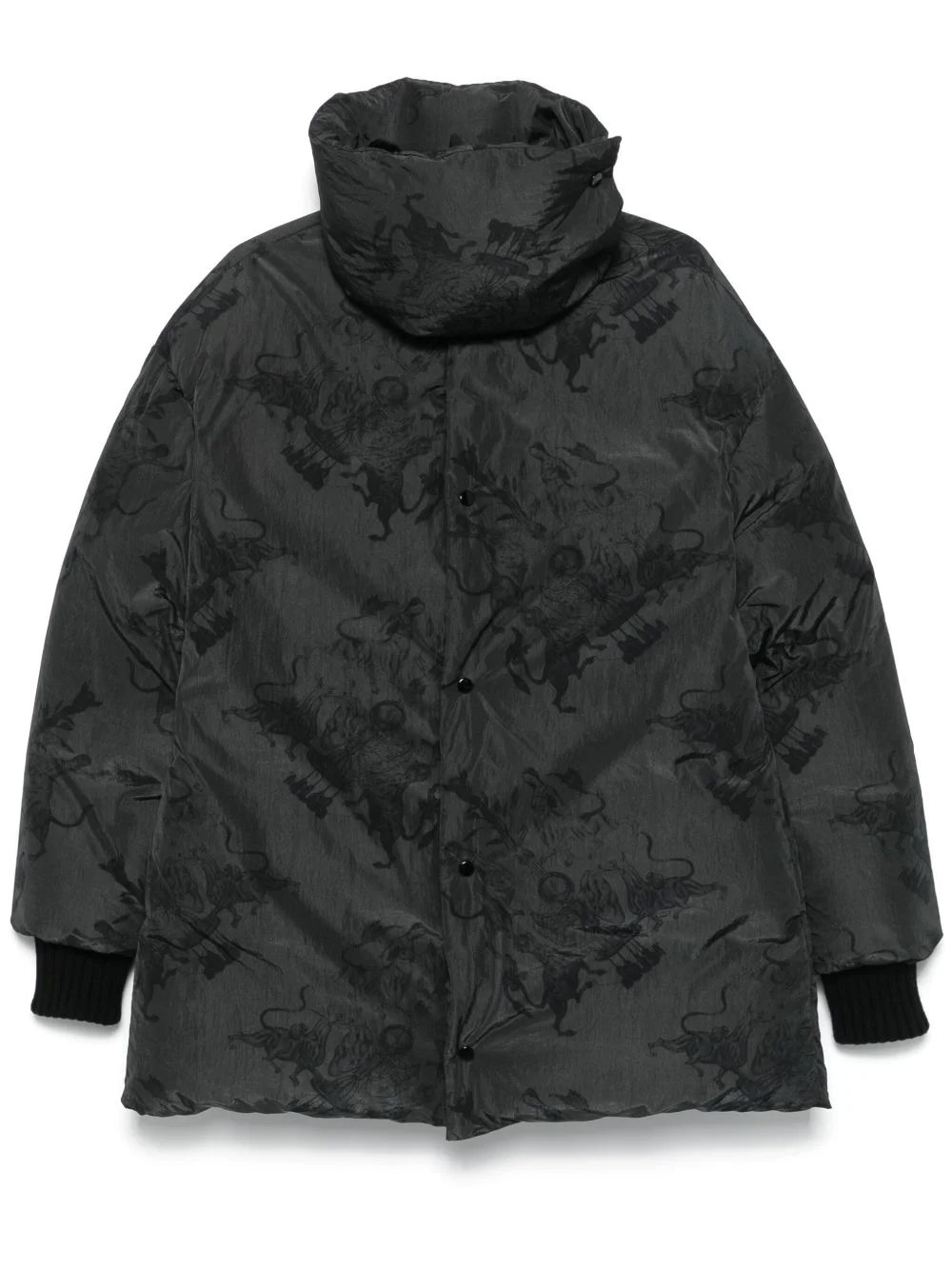 graphic-print coat Highlights - Black - Goose down - Padded design - Front press-stud fastening - All-over tonal graphic print - Detachable hood - Drop shoulder - Elasticated cuffs - Two side inset pockets - Full lining - Straight hem Made in Italy Composition Lining: Polyamide 100%, Goose Down 90%, Virgin Wool 75%, Silk 15%, Goose Feather 10%, Cashmere 10% Outer: Polyamide 100% Washing instructions Dry Clean Only