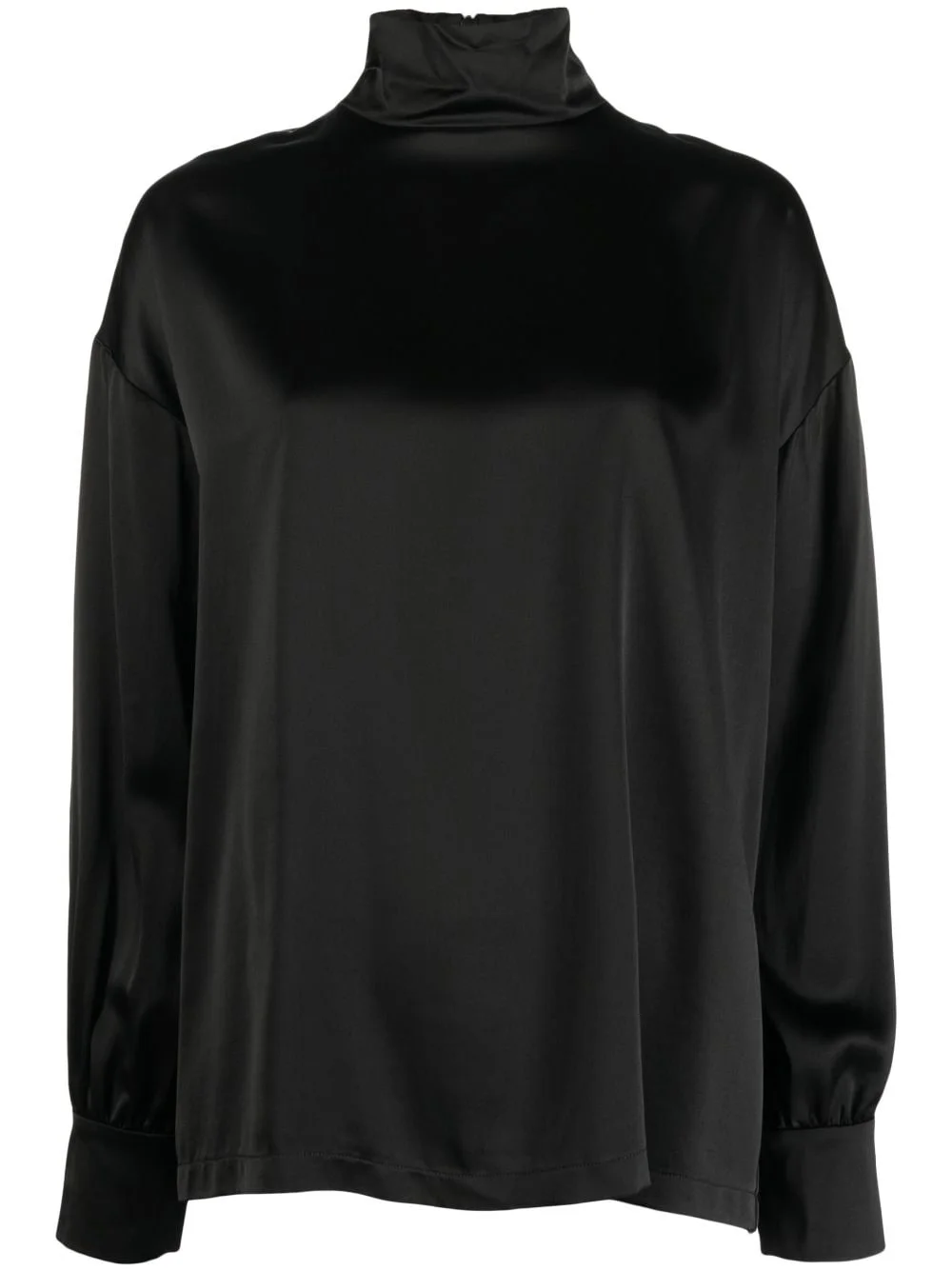 high-neck satin blouse Highlights - Black - Satin finish - High neck - Rear button fastening - Drop shoulder - Long sleeves - Straight hem Made in Italy Composition Viscose 87%, Wool 13% Washing instructions Dry Clean Only
