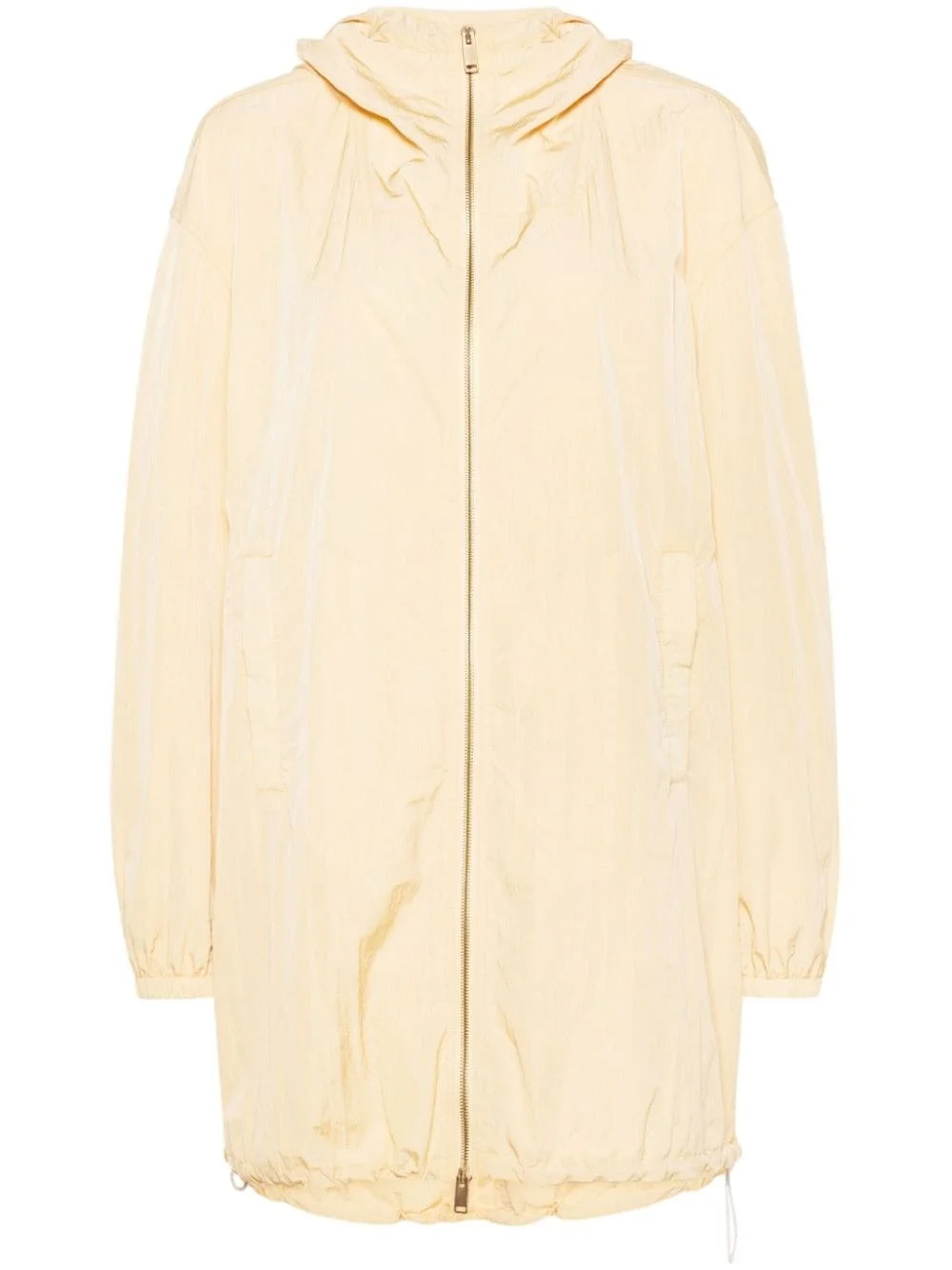 hooded parka coat Highlights - Sherbet yellow - Crinkled finish - Drawstring hood - Mock neck - Front two-way zip fastening - Drop shoulder - Long sleeves with elasticated cuffs - Two side welt pockets - Rear drawstring fastening - Drawstring hem - Full lining Made in Italy Composition Outer: Polyamide 100% Lining: Polyamide 100% Washing instructions Dry Clean Only
