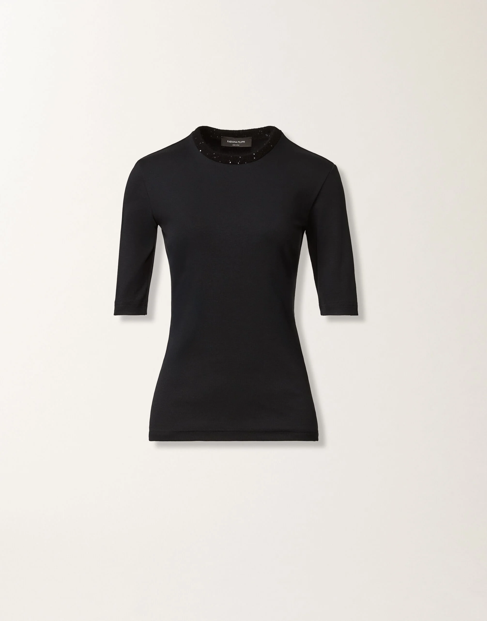 Made of ribbed jersey, this T-shirt with a slim cut features a collar embellished with bright sequins and refined elbow-length sleeves. A versatile and elegant garment, perfect for any occasion. Produced entirely in Italy through sustainable processes. The model is 1,79m tall and is wearing size IT 40 Details Fine-rib jersey Sequins Slim Fabric: 94% cotton - 6% elastane Length: 62 cm (size 40) Made in Italy Model JED215F129L58100005146