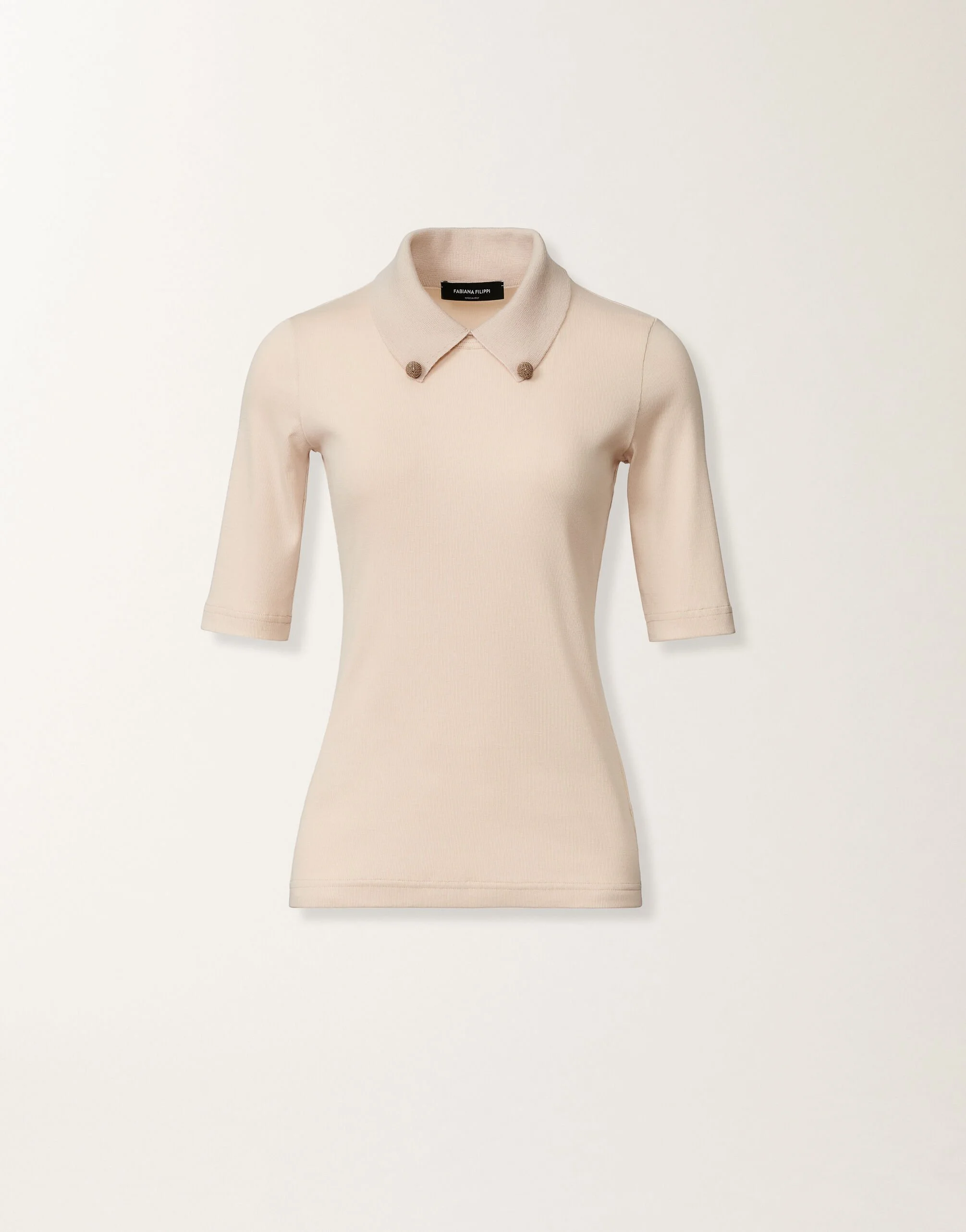 Made of ribbed jersey, this T-shirt with a slim cut features a collar embellished with bright sequins and refined elbow-length sleeves. A versatile and elegant garment, perfect for any occasion. Produced entirely in Italy through sustainable processes. The model is 1,8m tall and is wearing size IT 40 Details Ribbed jersey Knit collar Sphere pin detail with diamond thread Fabric: 94% cotton – 6% elastane Length: 59 cm (size 40) Made in Italy Model JED215F132L57600002199