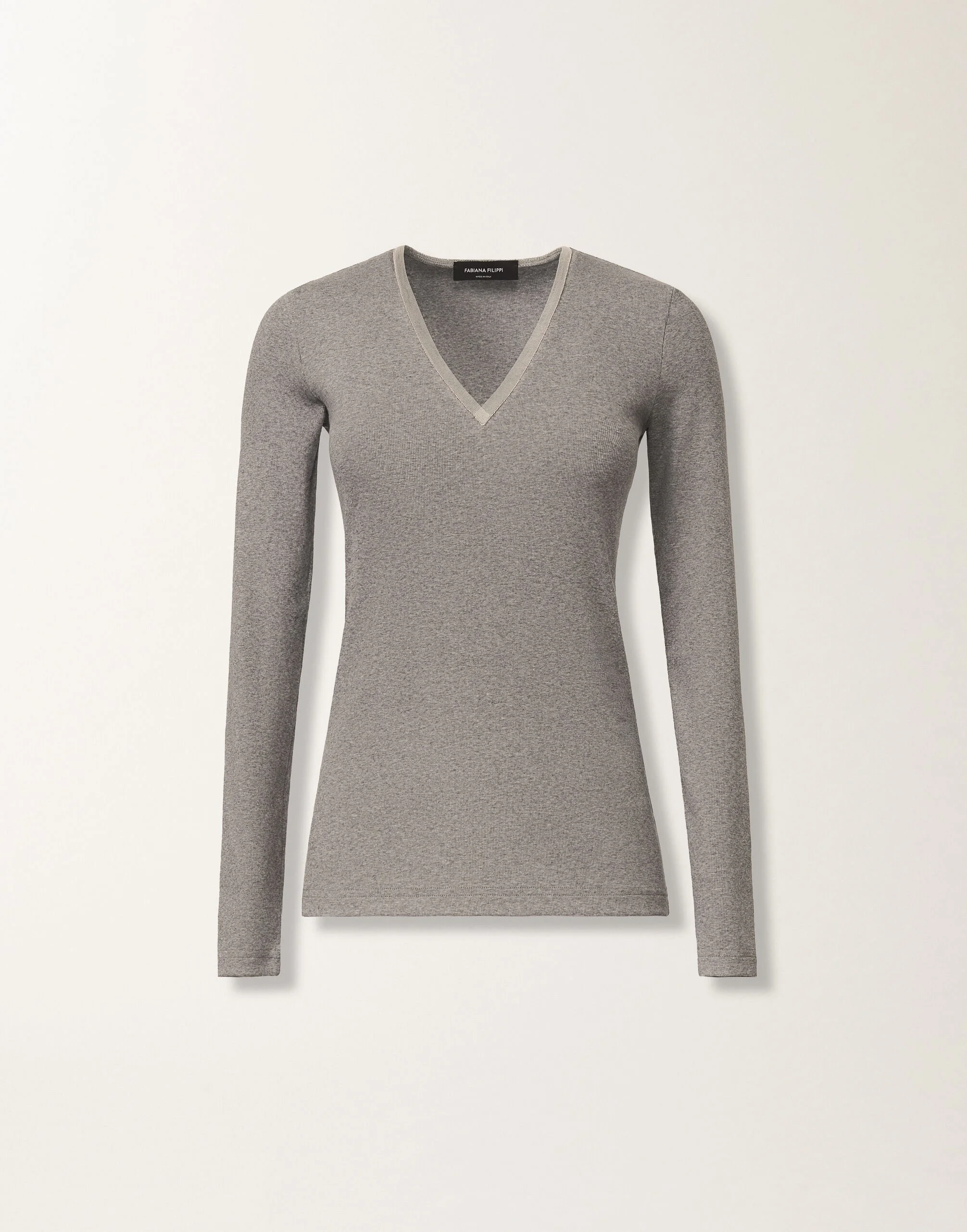 Made of ribbed jersey, this T-shirt with a slim cut features a collar embellished with bright sequins and refined elbow-length sleeves. A versatile and elegant garment, perfect for any occasion. Produced entirely in Italy through sustainable processes. The model is 1,79m tall and is wearing size IT 40 Details Fine-rib jersey Tulle Diamond thread sphere Fabric: 94% cotton - 6% elastane Length: 62 cm (size 40) Made in Italy Model JED215F130L57700008132