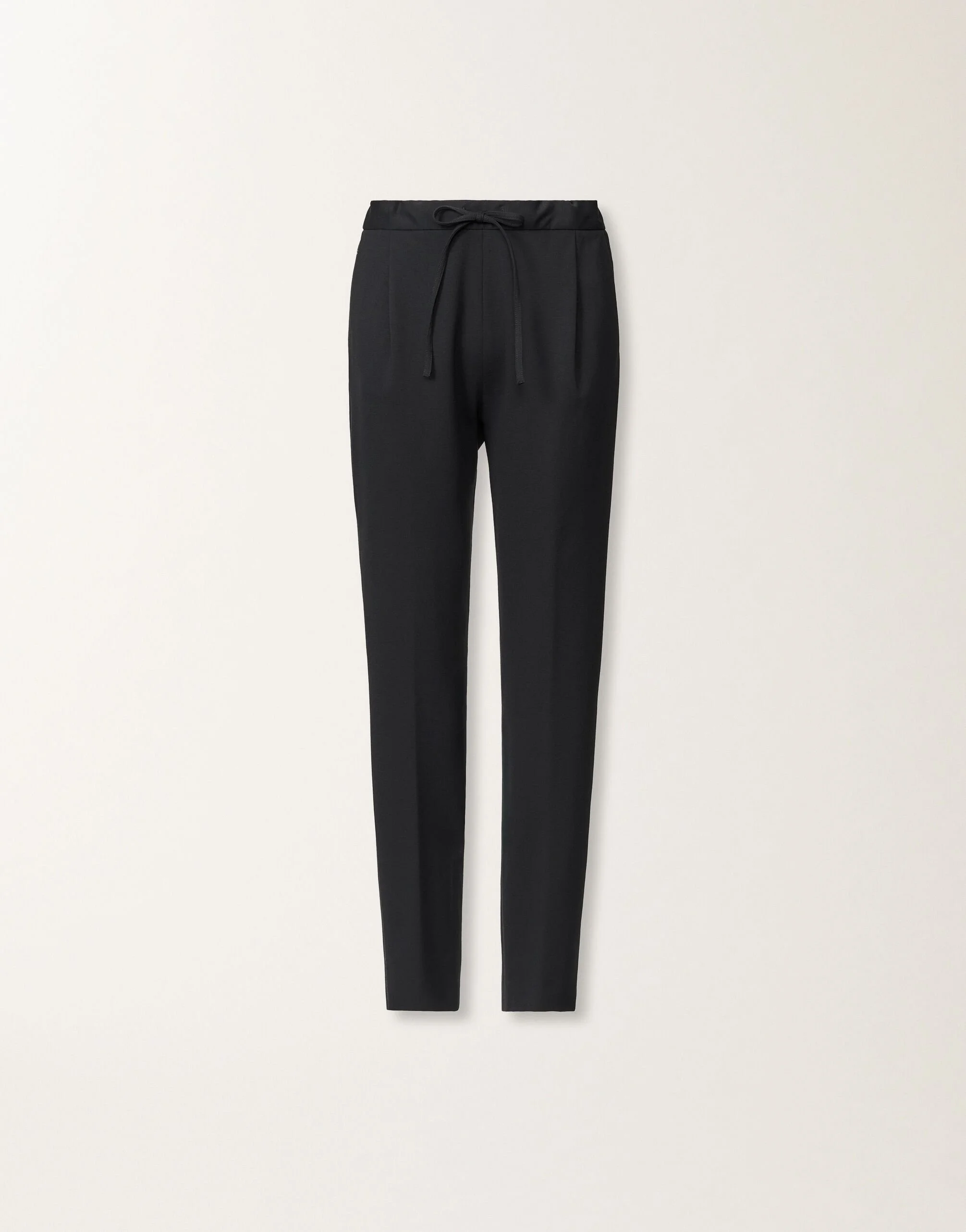 Made of Milan rib viscose jersey, these jogging trousers with pleats are a versatile and comfortable garment, embellished with diamond thread. Their clean cut and lightweight fabric make them ideal for any everyday occasion. Produced entirely in Italy through sustainable processes. The model is 1,76m tall and is wearing size IT 40 Details Jersey Milano rib Diamond thread Jogging trousers Dart Fabric: 56% viscose - 36% polyamide - 8% elastane Made in Italy Model PAD215F366L52100005146
