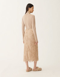 This sophisticated pencil skirt is made of refined macrame lace. Inspired by the work Combustioni by Alberto Burri, the ultra-light lace, enriched with a thread of mohair, experiments with contrasts of porosity and thickness. Produced entirely in Italy through sustainable processes. The model is 1,76m tall and is wearing size IT 40 Details Macrame lace Pencil skirt Fabric: 23% cotton - 19% polyester - 15% mohair - 15% alpaca - 15% nylon – 13% polyamide Knit belt: 100% virgin wool Made in Italy Model GND215F417L55400000157