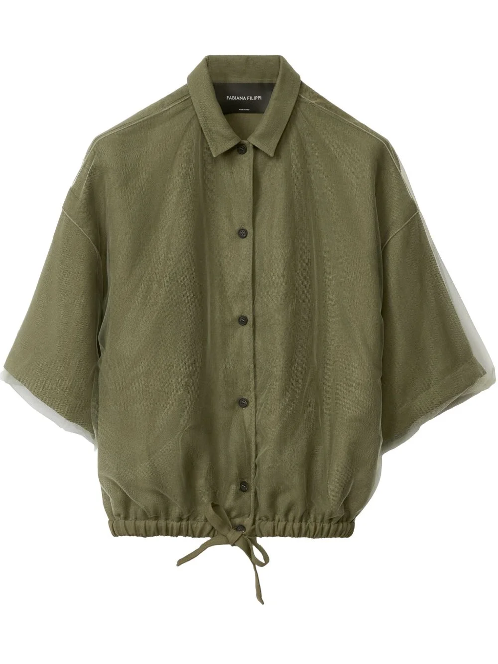 mesh-overlay shirt Highlights - Avocado green - Front button fastening - Front tie fastening - Elasticated hem - Drop shoulder Made in Italy Composition Fabric 100% Washing instructions Read Manufacturer Guidelines