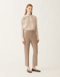 The Autumn-Winter 2025–26 collection celebrates unique materials, like these regular-fit trousers in bi-stretch fresco wool. Embellished with a luminous diamond thread loop, entirely made in Italy through sustainable processes. The model is 1.79 meters tall and wears size IT 40. Details Bi-stretch fresco wool Diamond thread loop Fabric: 75% virgin wool – 23% polyamide – 2% elastane Made in Italy Model PAD215F326L52300000157