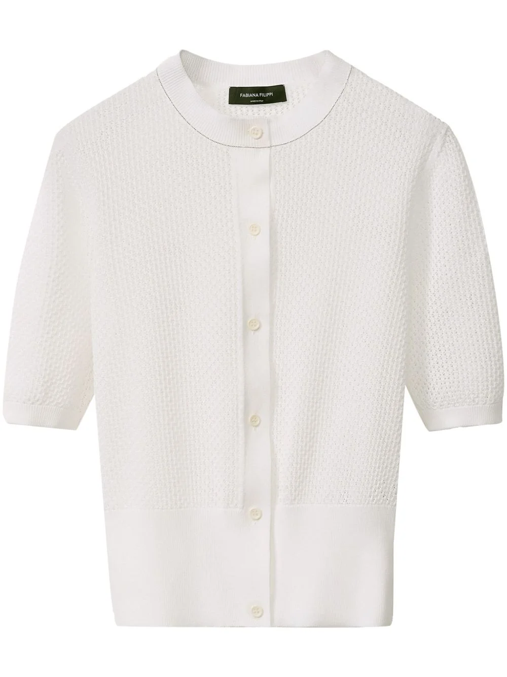 open-knit cardigan Highlights - White - Front button fastening - Crew neck - Half-length sleeves - Ribbed cuffs and hem Made in Italy Composition Fabric 100% Washing instructions Read Manufacturer Guidelines