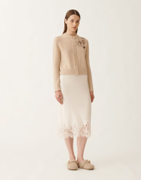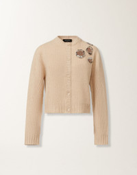 This crew-neck cardigan, made of Platinum, Fabiana Filippi's exclusive yarn that combines wool, cashmere and silk, features "jewel burn" embroidery. Made entirely by hand, it is inspired by the combustion technique of the artist Alberto Burri, and transforms the holes into precious encrustations of crystals and rhinestones. Produced entirely in Italy through sustainable processes. The model is 1,8m tall and is wearing size IT 40 Details Platinum yarn Jewel embroidery Fabric: 75% wool - 15% silk - 10% cashmere Length: 50 cm (size 40) Made in Italy Model MAD215F057L53700000158