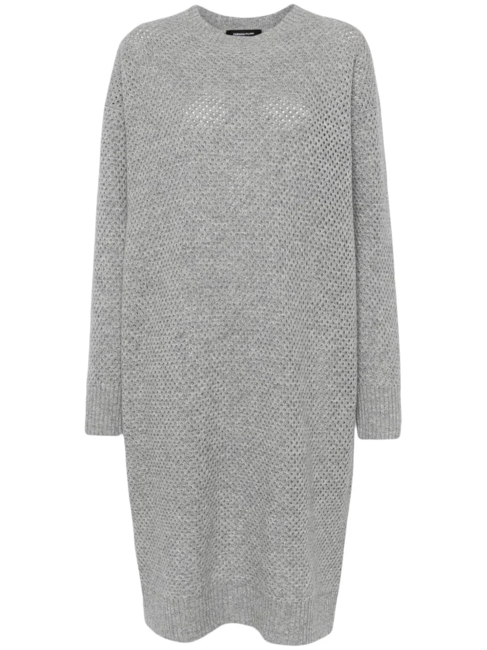 Platinum midi dress Highlights - Grey - Virgin wool blend - Open knit - Ribbed trim - Crew neck - Drop shoulder - Long sleeves - Unlined - Straight hem - Mid-length Made in Italy Composition Eco Brass 100%, Virgin Wool 75%, Silk 15%, Cashmere 10% Washing instructions Hand Wash